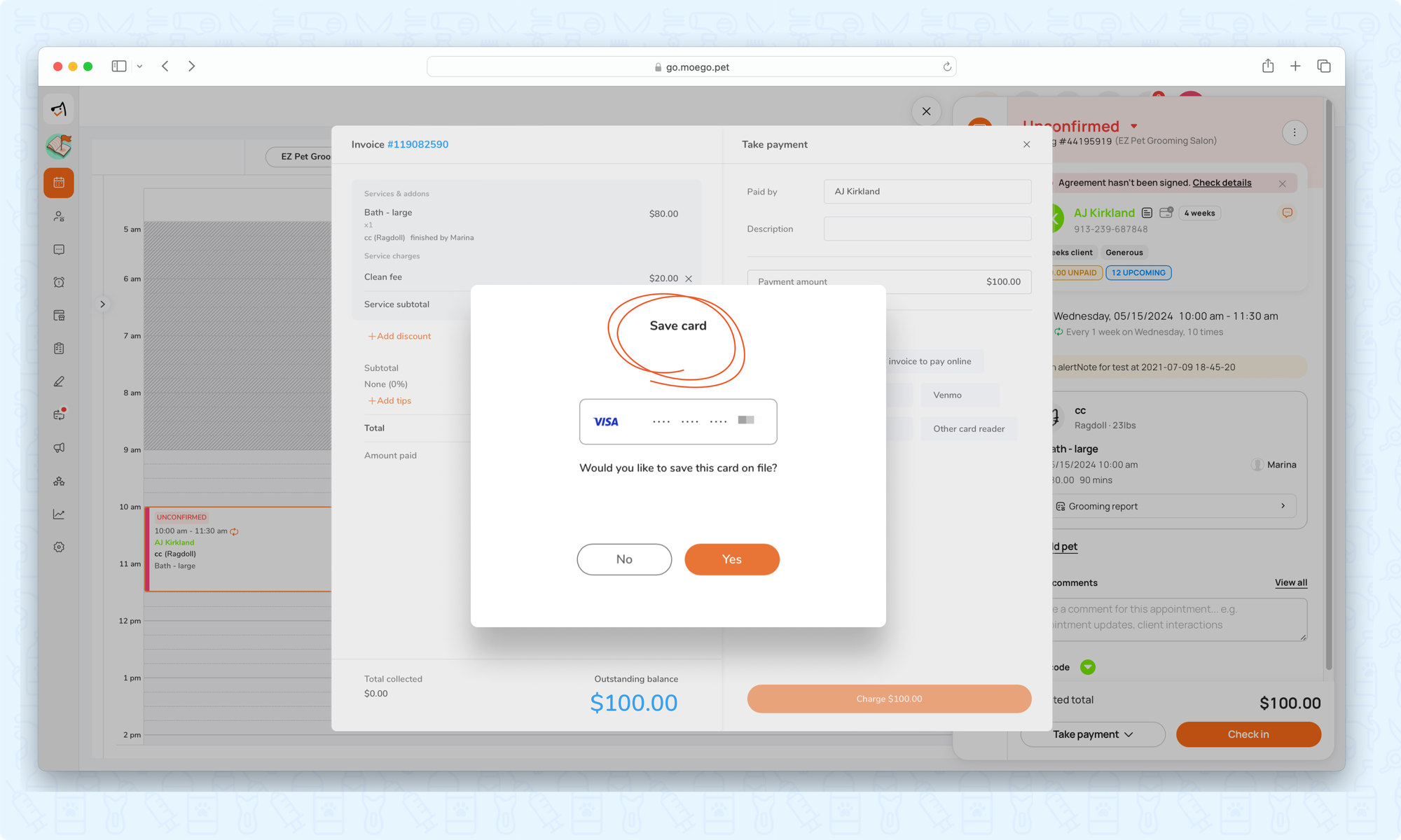 If the client pays by swiping/tapping/ inserting cards with hardware, there is a pop-up asking if you would like to save the card on file. You can click on "Yes" to save it!