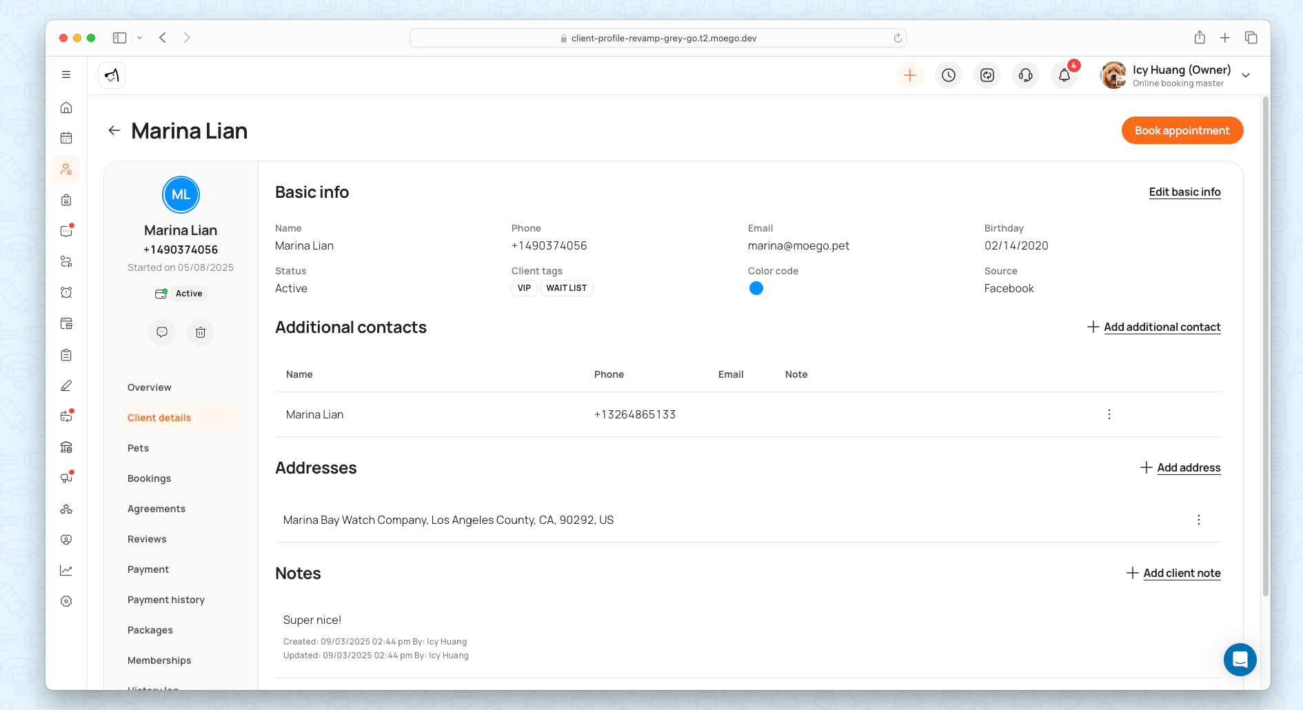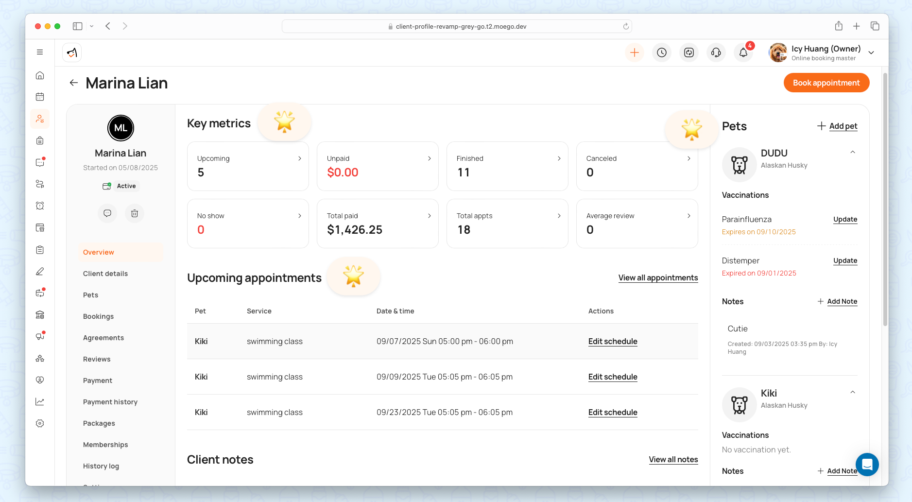 The redesigned Overview surfaces the most critical client and pet information at a glance, enhancing quick decision-making and management.