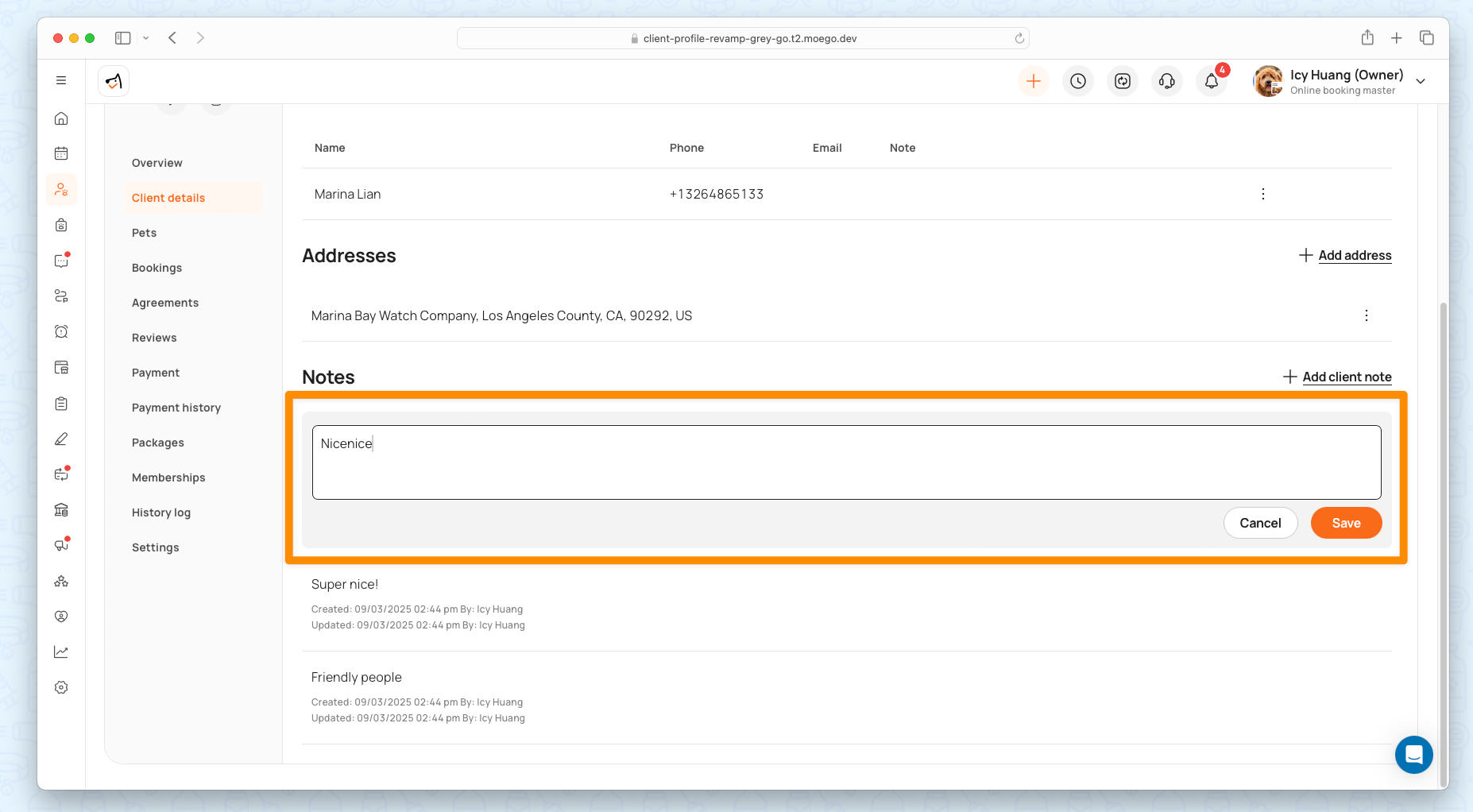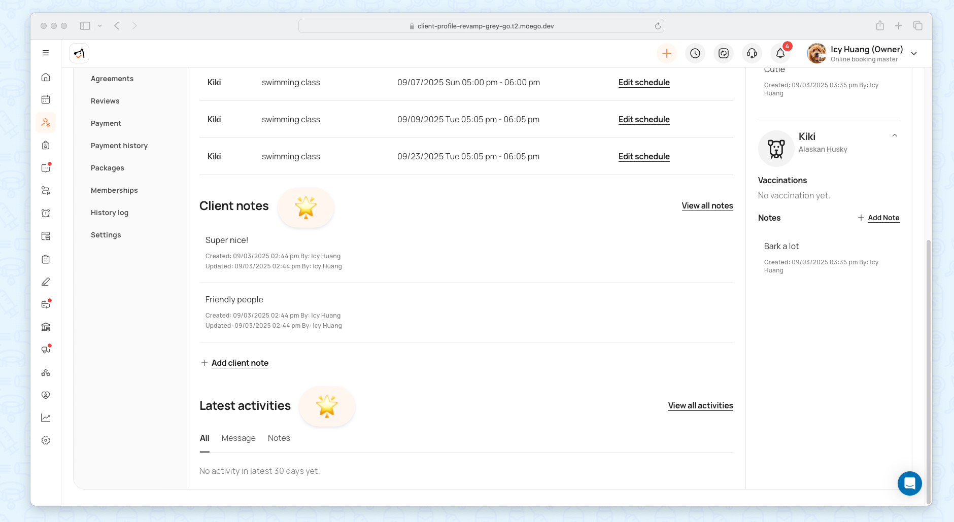 - Client Notes: Dedicated section for notes, with timestamps and staff attribution. An < Add client note > button keeps notes organized and accessible.