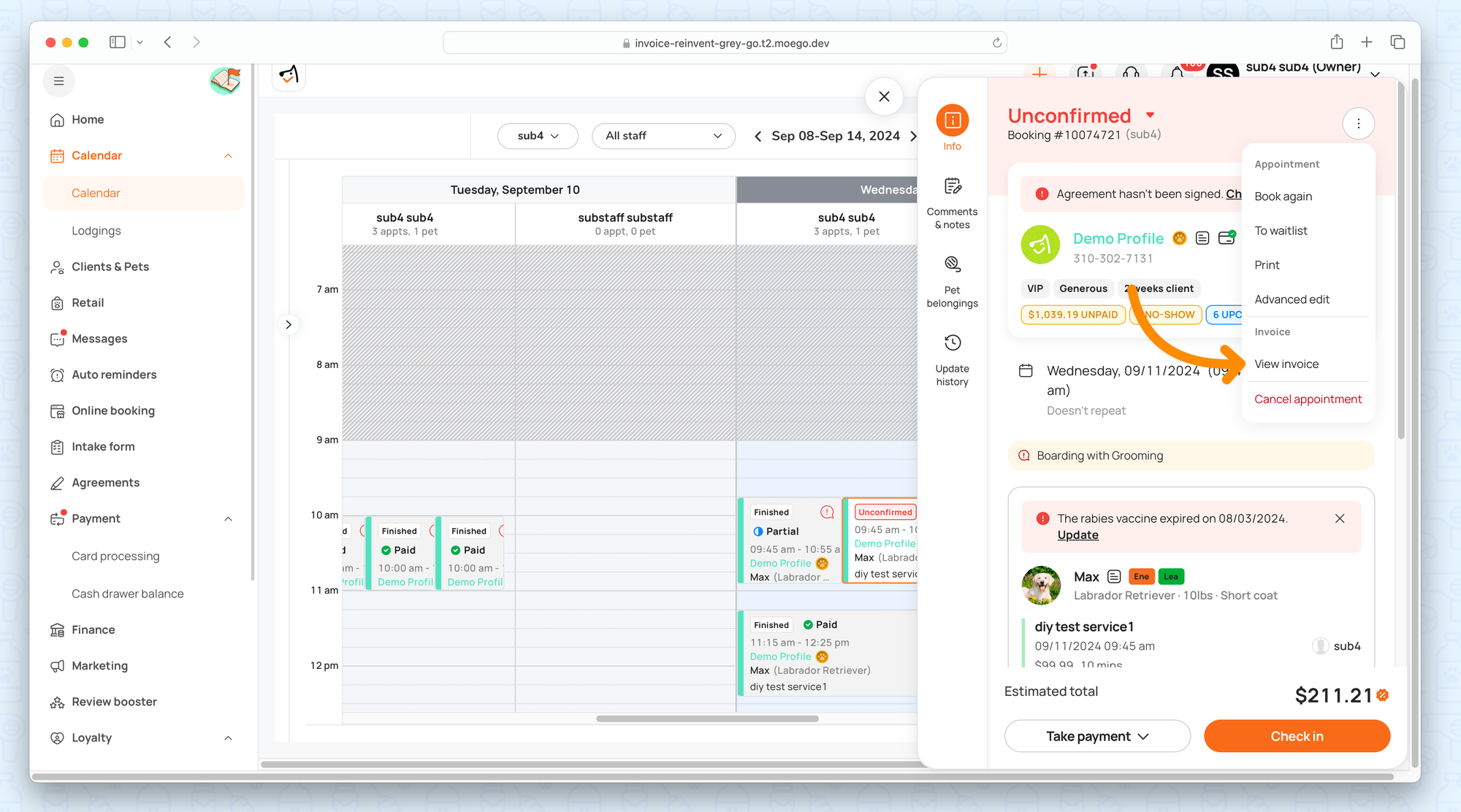 - Go to appointment details > 3 dots > View invoice.