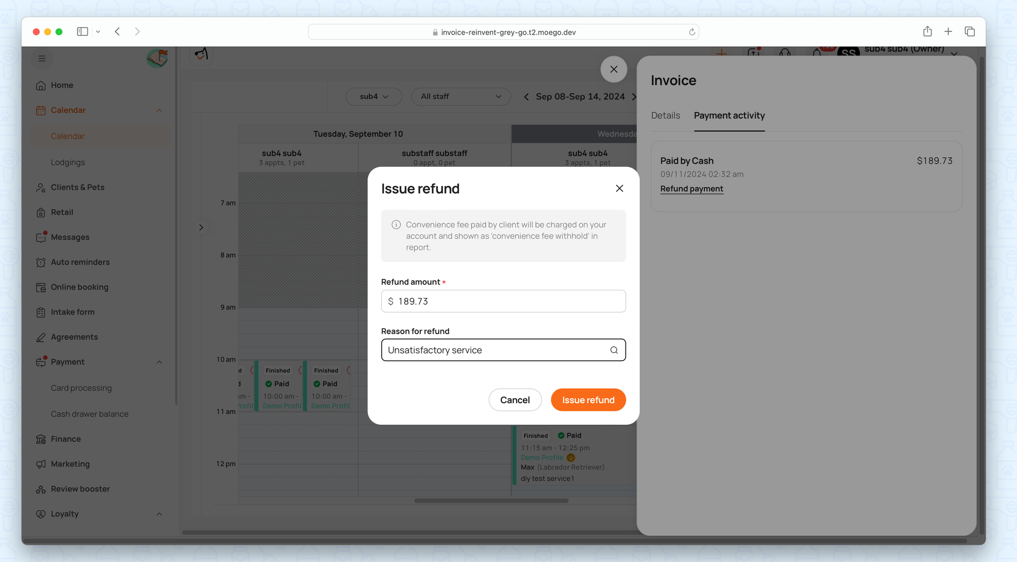 - Input refund reason and amount to issue refund.