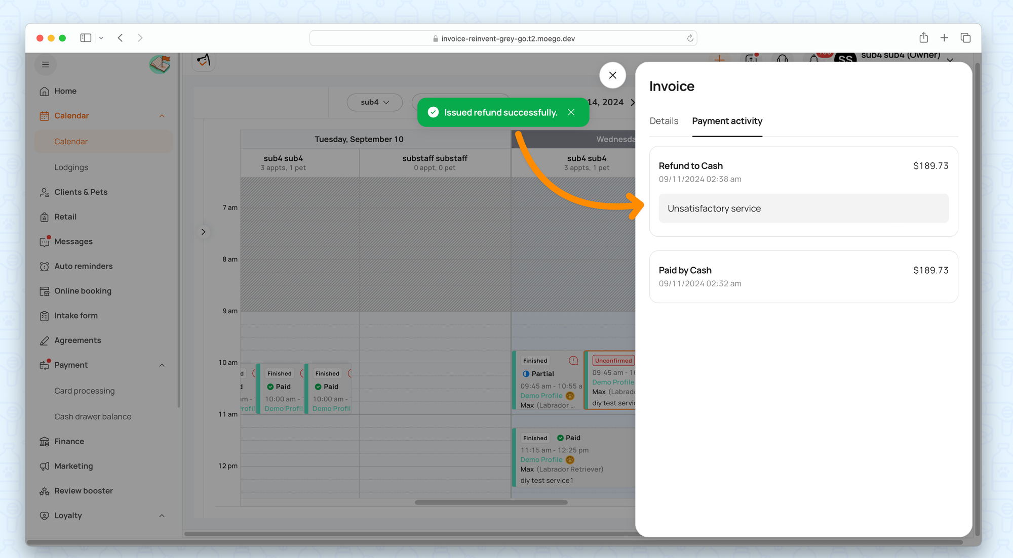 The system processes the refund using the original payment method (e.g., credit card or cash). If the refund is for a credit card payment, the refunded amount is sent back to the customer’s card. And the business will cover the processing fee on this credit card transaction.