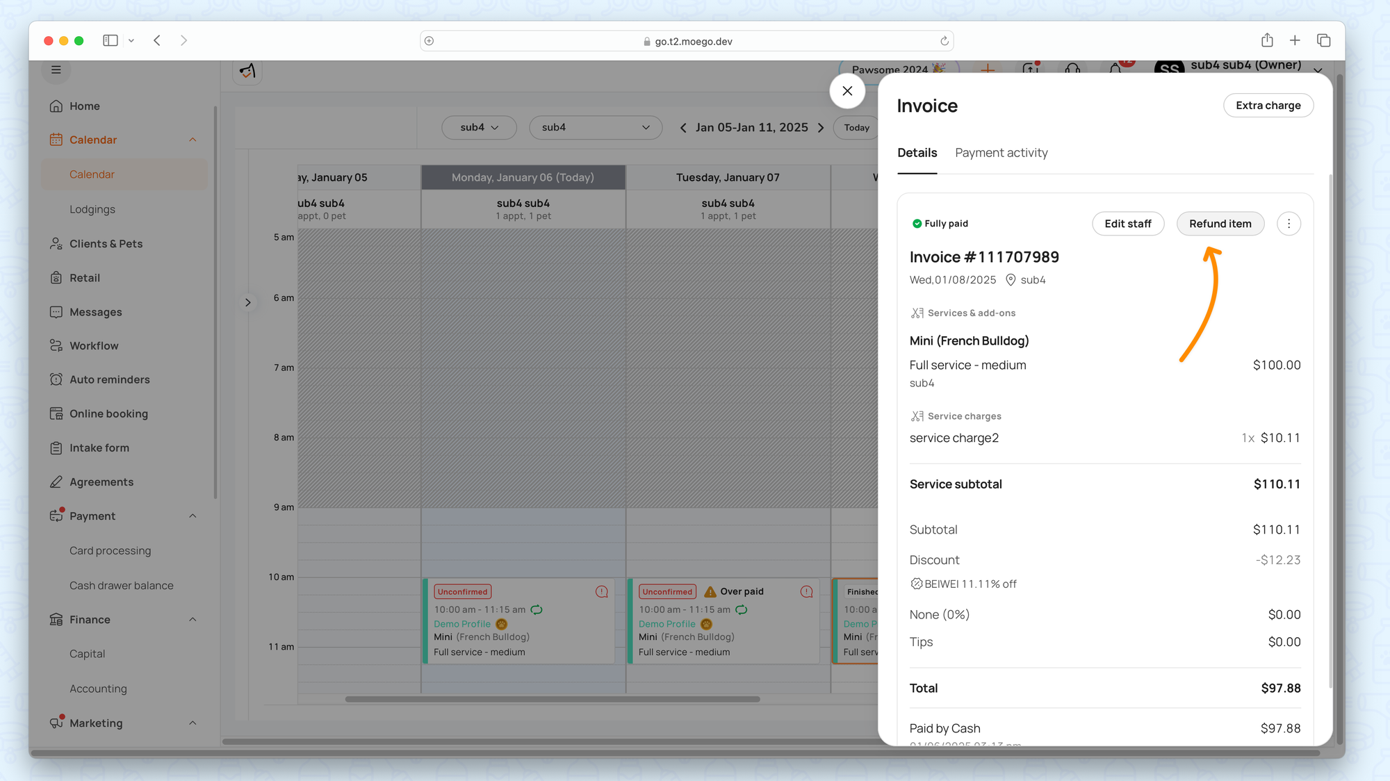 Although the invoice itself cannot be edited in terms of adding or removing services after being fully paid, you can still process item-level refunds.
