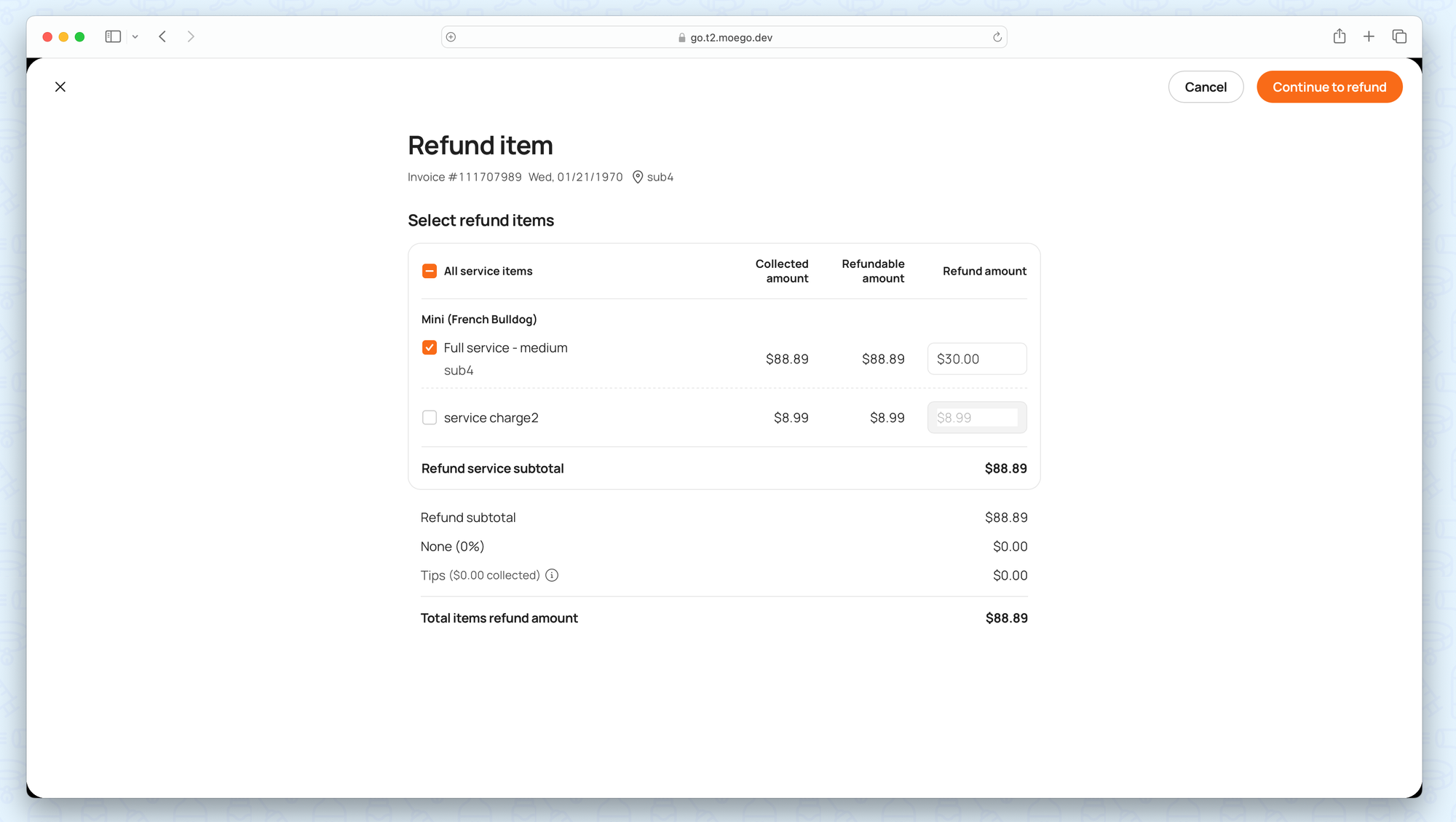 - Adjust the refund amount for a service item (You can choose to issue a full refund or a partial refund for a service that was not fully satisfactory).