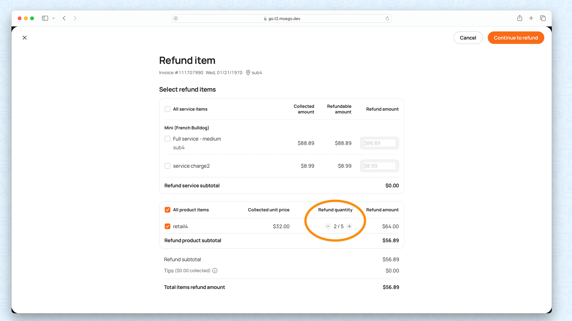 - Select specific services or products from the invoice to refund.