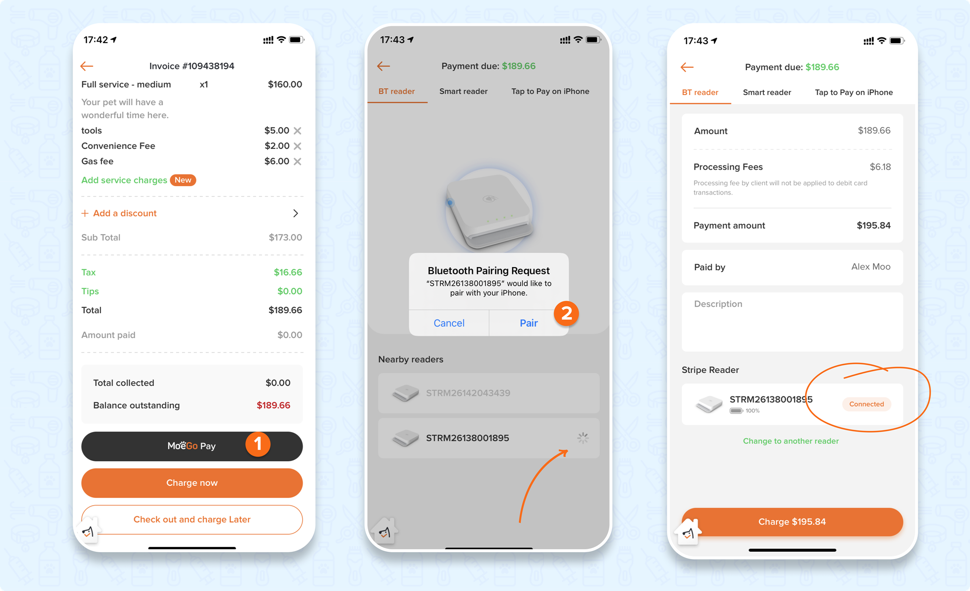 Staff does not necessarily have "access to card processing" to pair the Bluetooth reader when checking out.