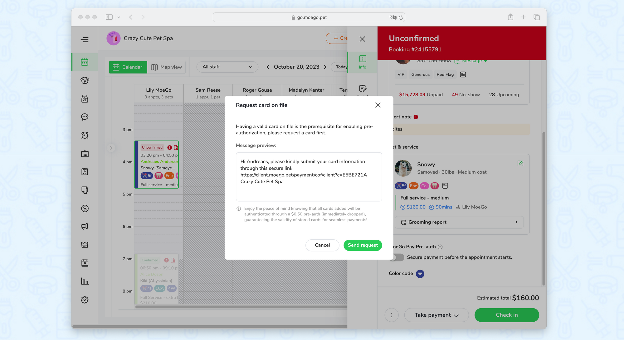 Once MoeGo Pay Pre-auth is enabled, the following is the charging process for appointments with a card on file: