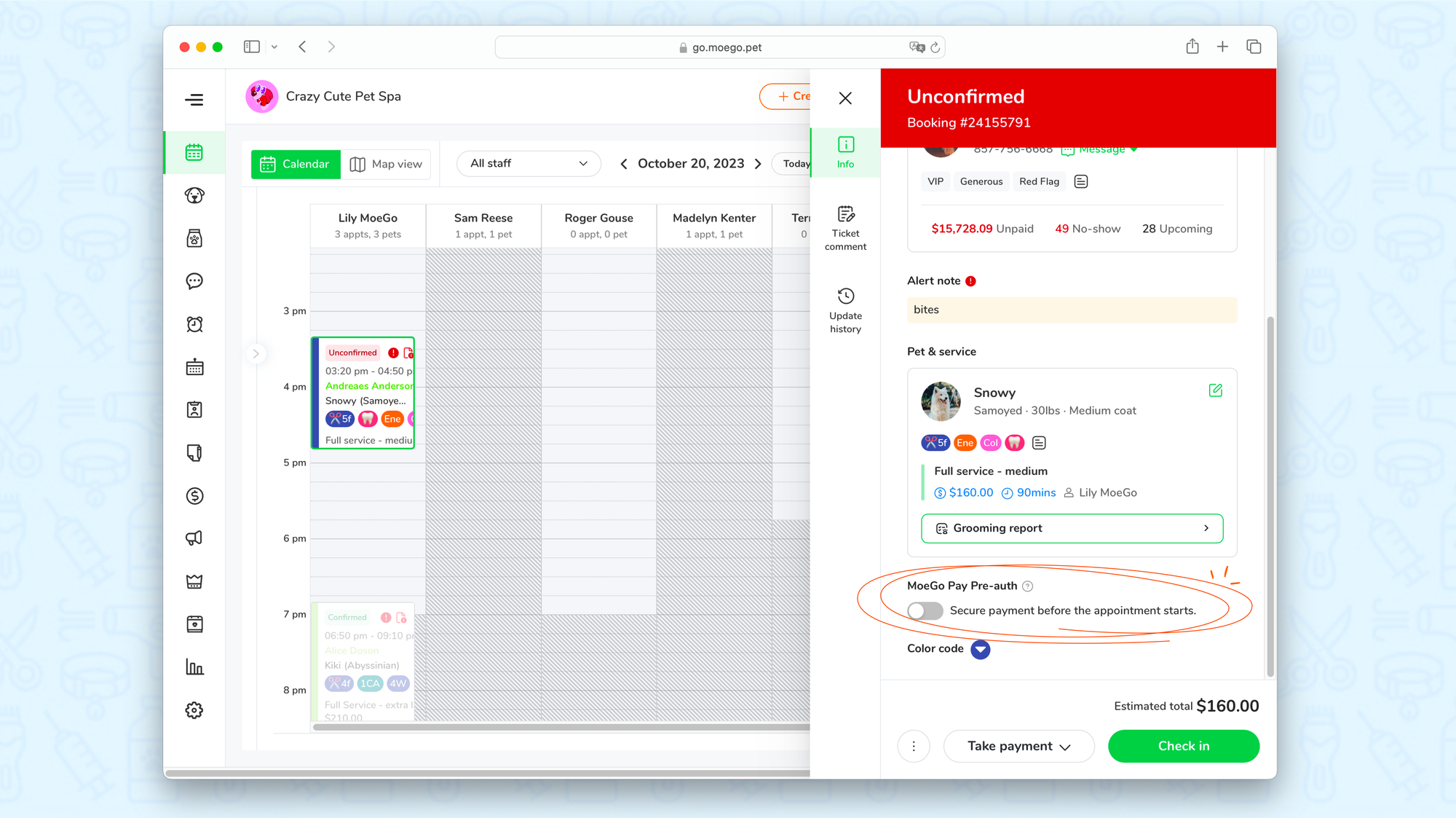 For the pre-auth'ed appointment, you can perform the checkout and take payment as usual, and the authorized fund will be captured along the way. What’s even better, if you were too busy to take payment, the pre-authorized amount will be automatically captured by the end of the service day.