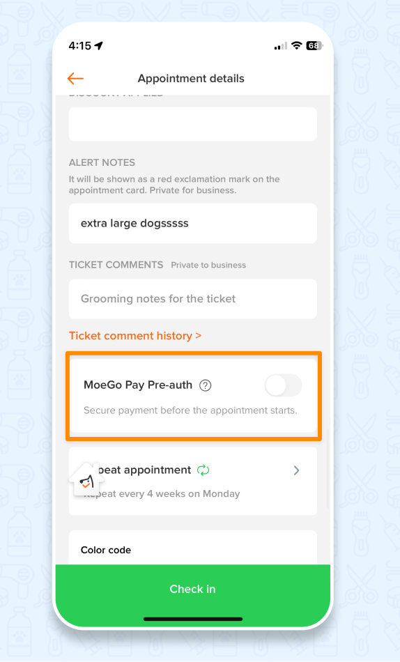 To enable Pre-auth only for specific clients, such as those with a history of no-shows, you can toggle on the <MoeGo Pay Pre-auth> option on the appointment detail page. This option is available both on the app and on desktop.