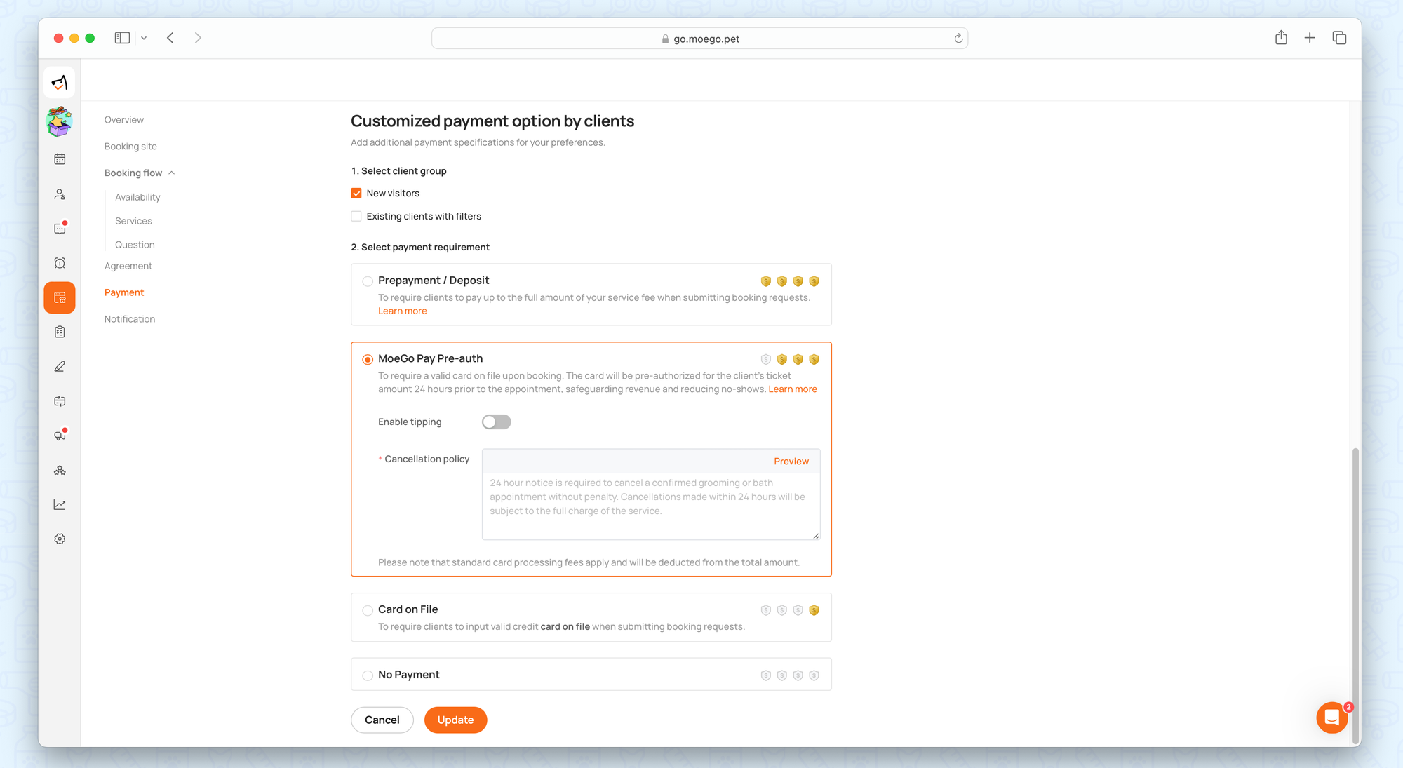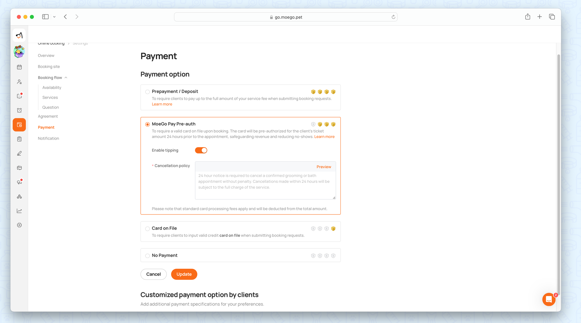 You can enable MoeGo Pay to preauthorize by 3 methods: 1. apply to all requests in Online Booking, 2. apply to selected clients' requests in Online Booking, 3. apply to specific appointments.