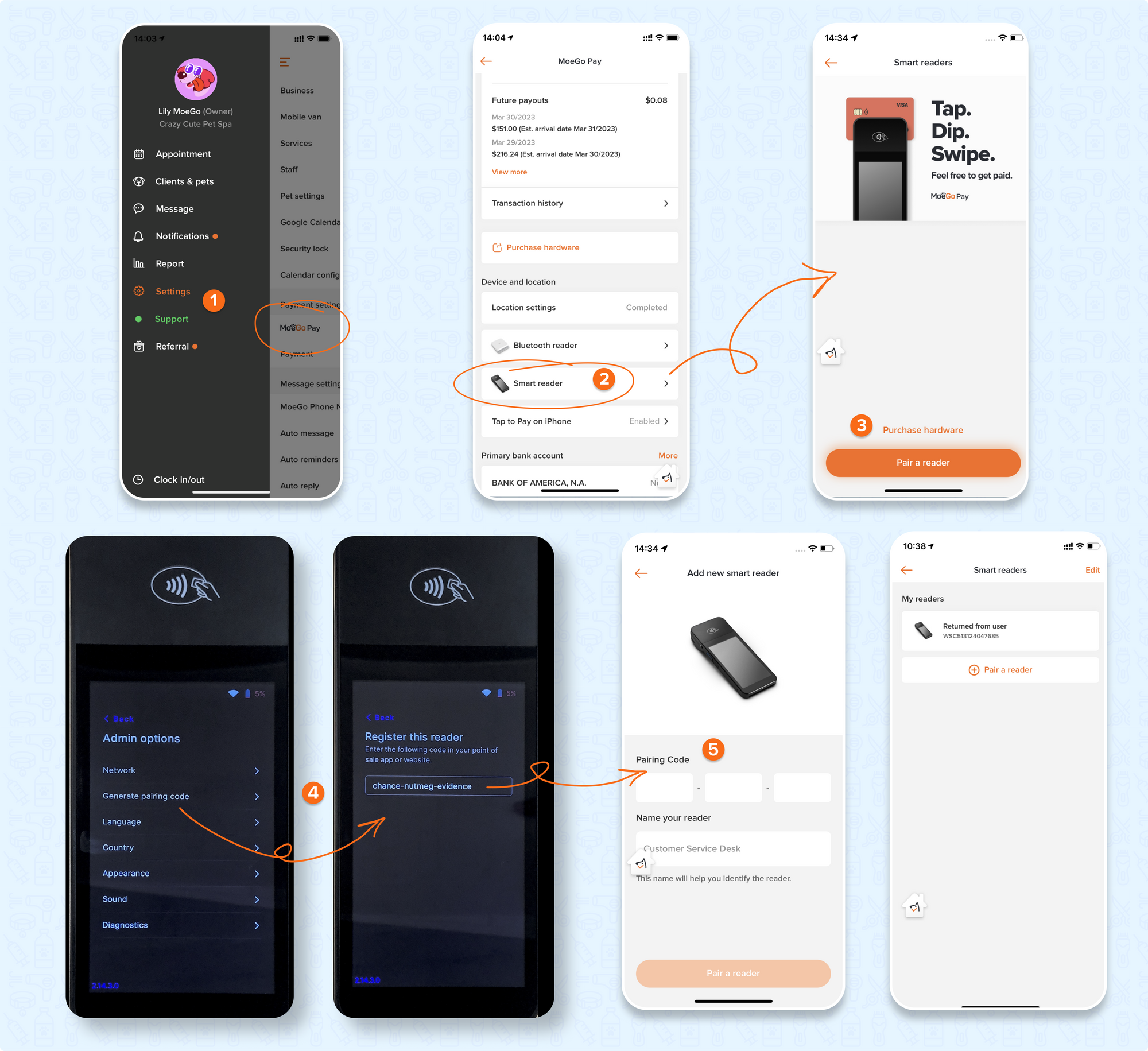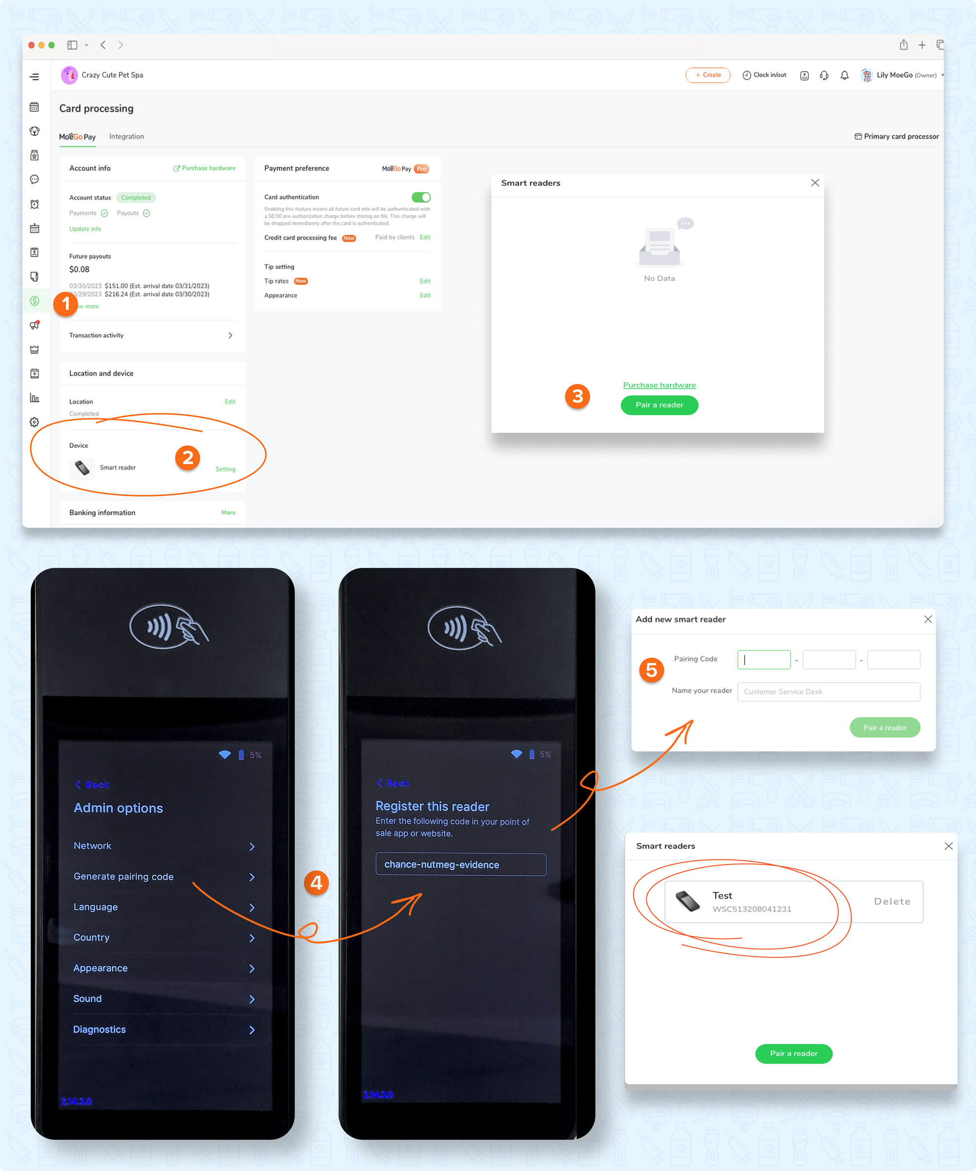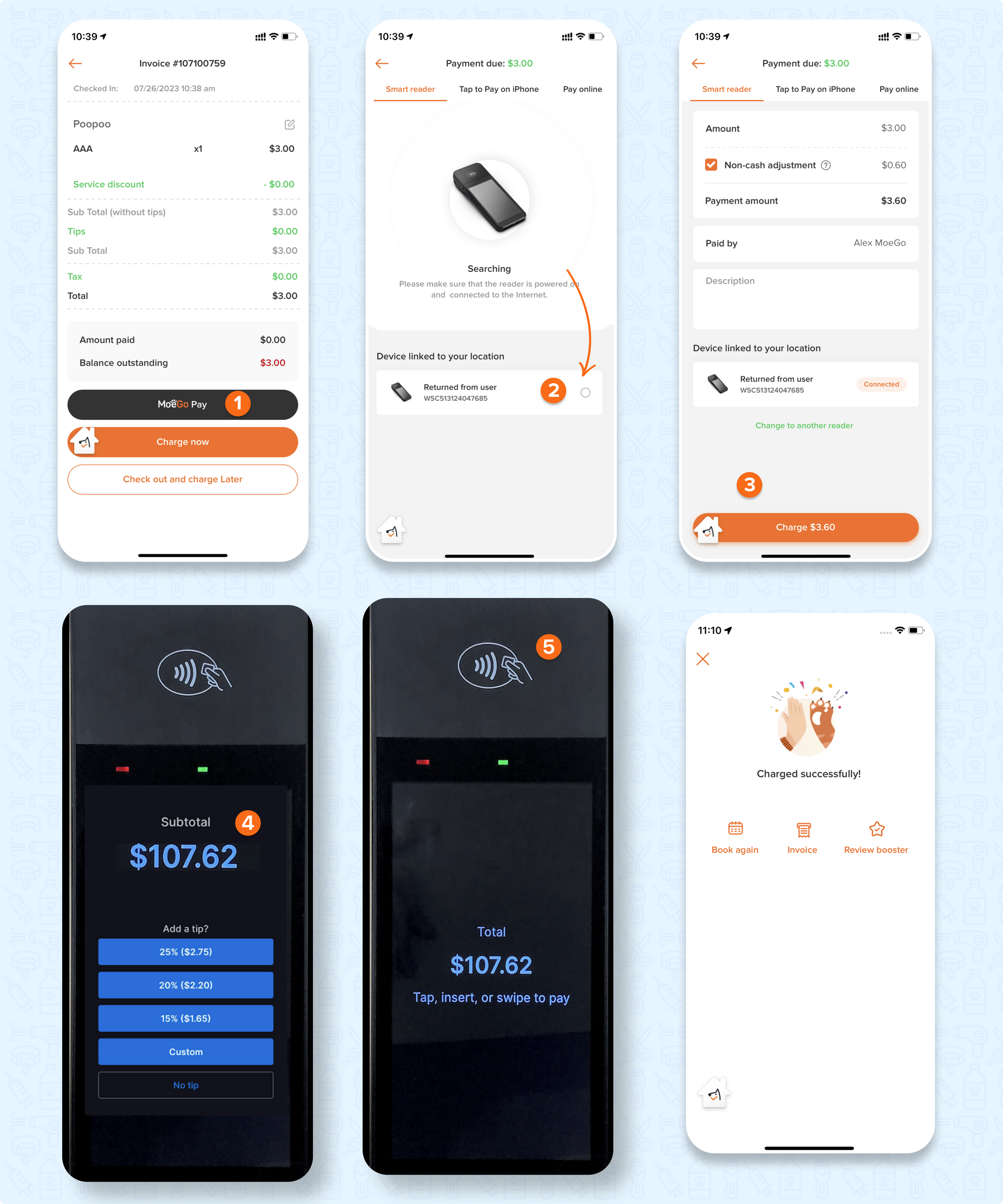 Smart Reader, known as WisePOS™ E, is the card reader with touchscreen display and compatible with both MoeGo Web and MoeGo Mobile App via WiFi, ideal for premium checkout experience for your salon customers.