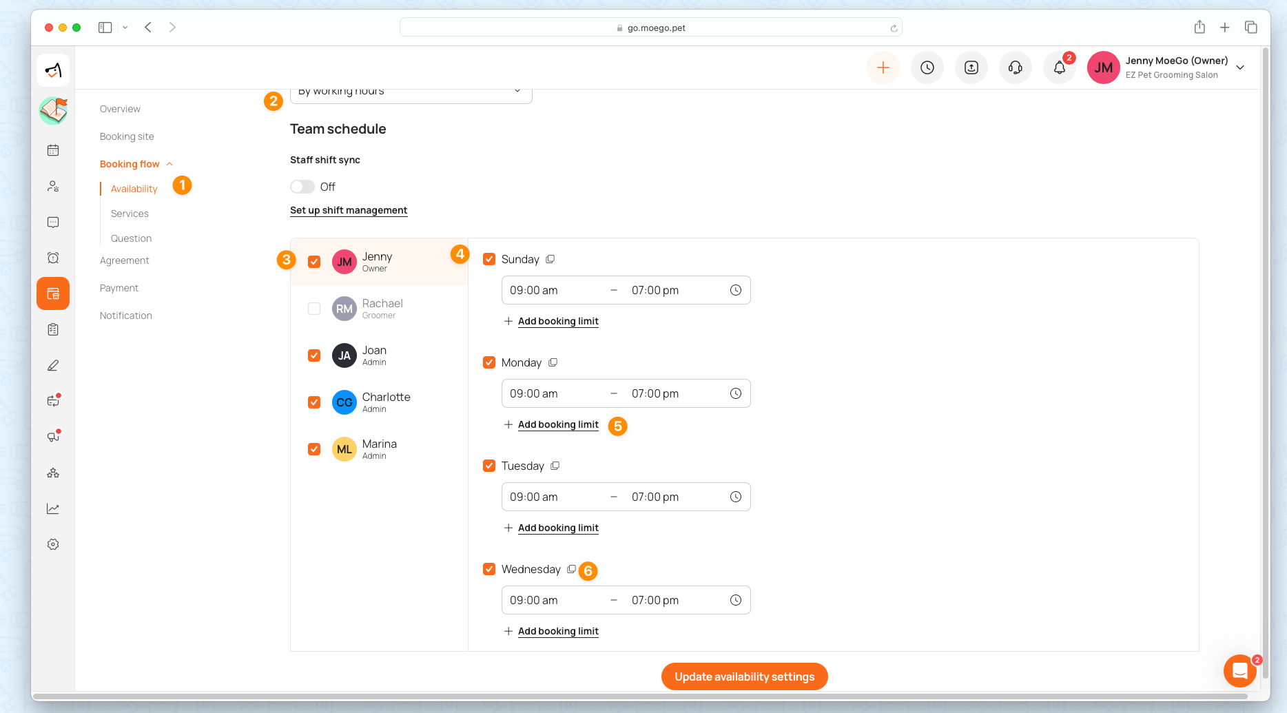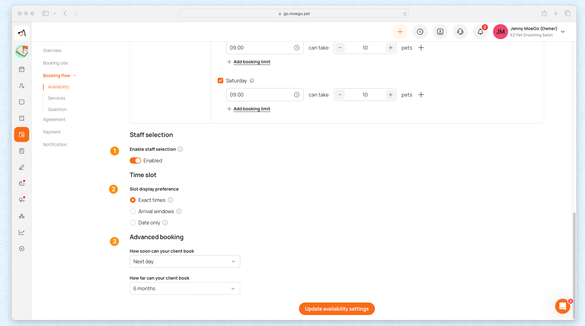 Booking Limits allow businesses to set maximum appointment slots for pet sizes or breeds. This ensures balanced workloads, prevents overbooking, and helps maintain service quality.