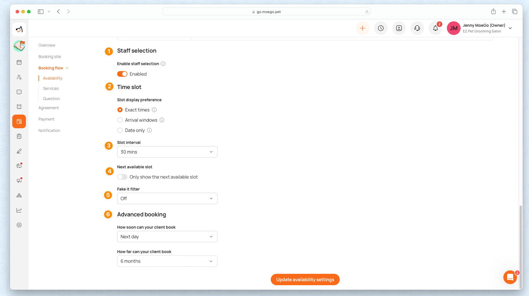 As businesses handle appointments in their unique ways, we offer a variety of availability settings to supercharge your online booking experience. This gives you the flexibility to match your business needs and rhythm effortlessly.