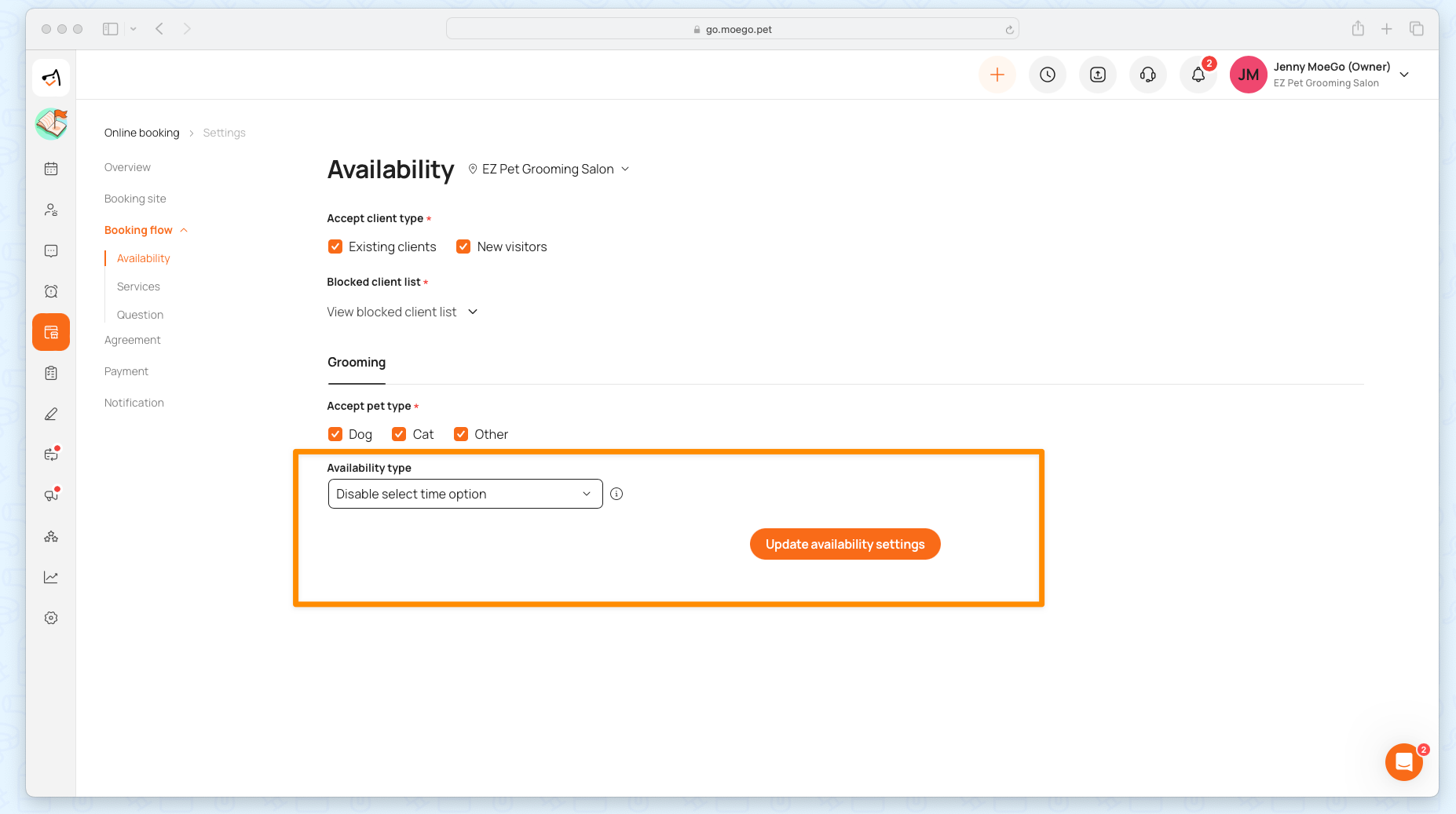 - Go to Online Booking > Settings > Availability