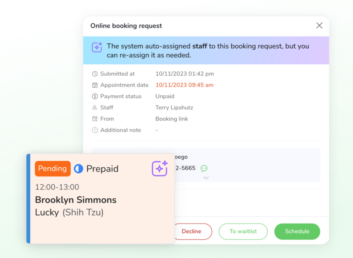 The system automatically assigns the next available time slot and staff member to these bookings, marking them as pending requests.