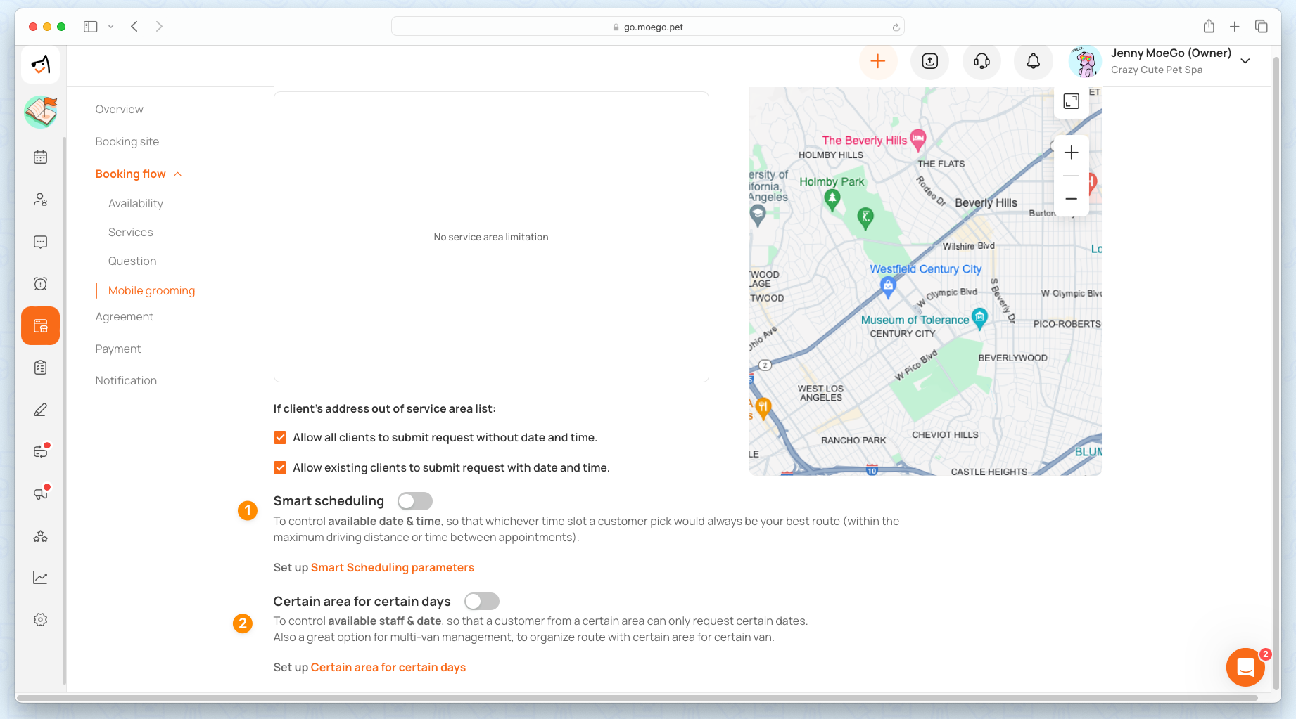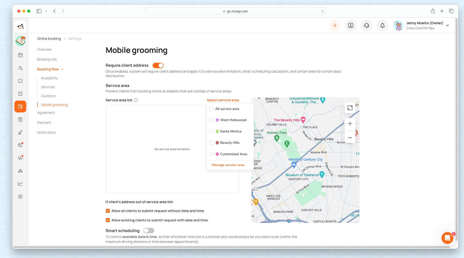 MoeGo Online Booking is a powerful tool that streamlines mobile grooming operations. It offers Smart Scheduling to manage available dates and times, and automated checks to ensure clients fall within your service area. You can set certain areas for certain days to optimize routes for multi-van conditions.