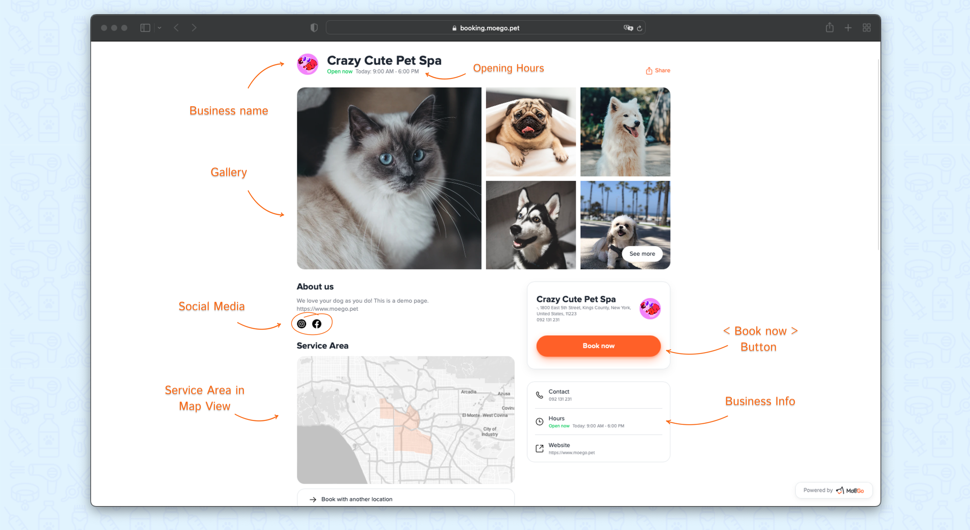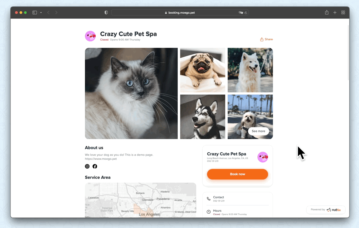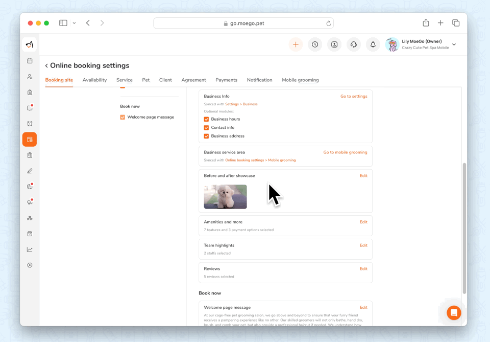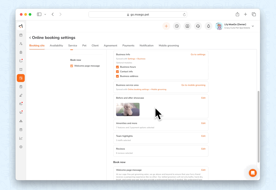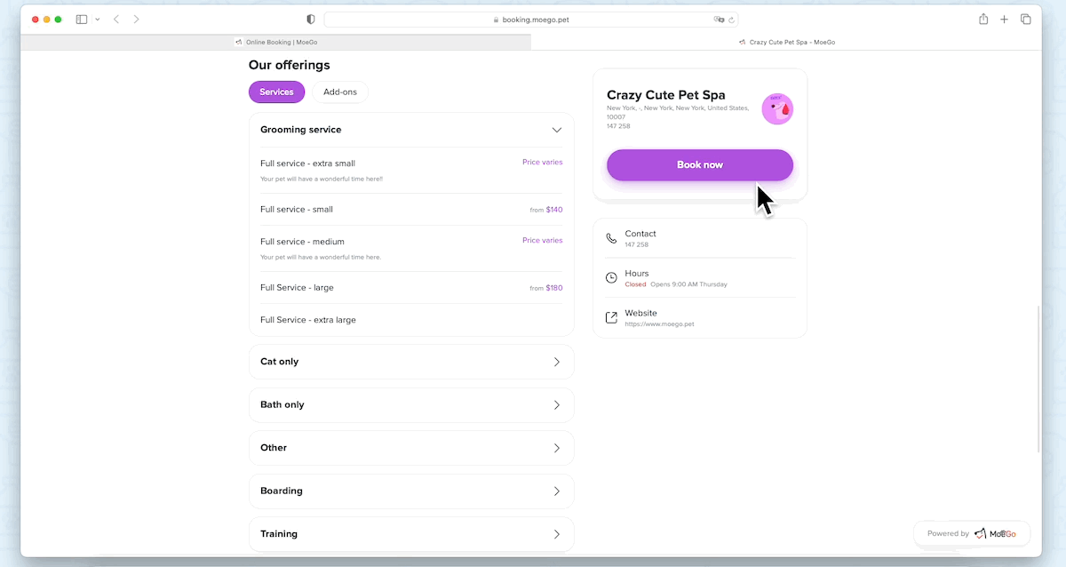 Boost your online presence effortlessly with MoeGo's personalized Storefront Page, crafted to simplify the online grooming booking process!