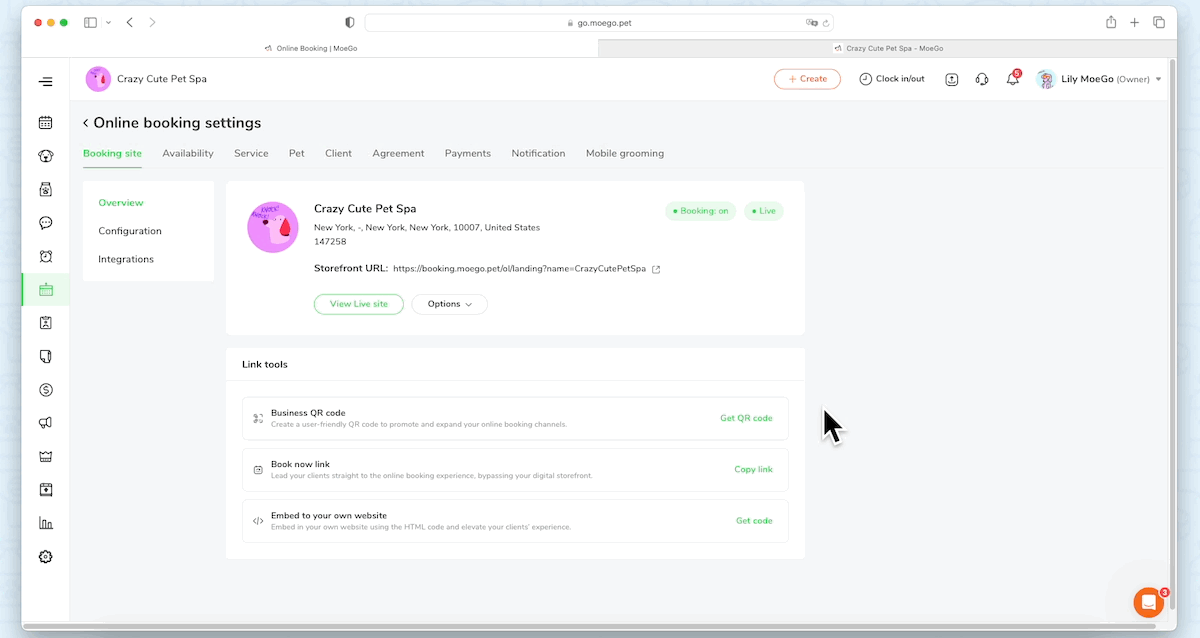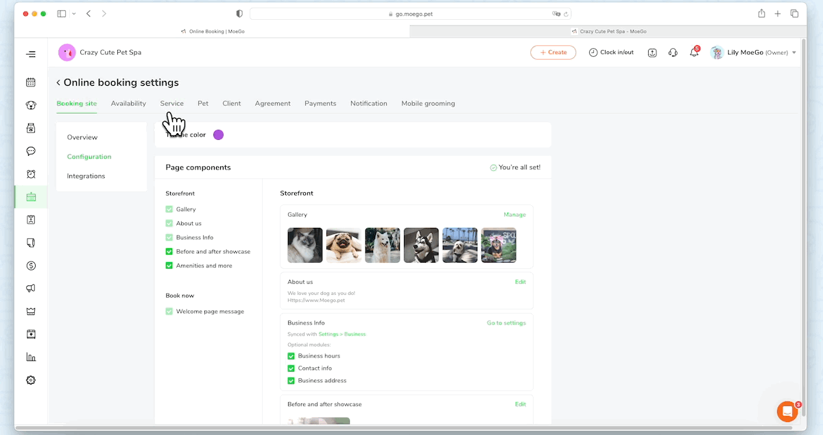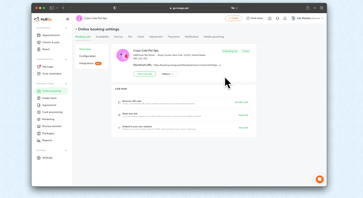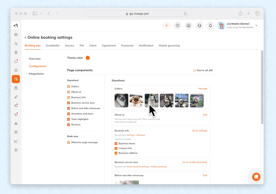Boost your online presence effortlessly with MoeGo's personalized Storefront Page, crafted to simplify the online grooming booking process!