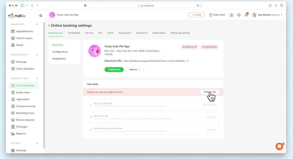 After setting up the landing page, you can go to Online Bookings > Settings > Booking site > Overview to publish the site and enable online booking.