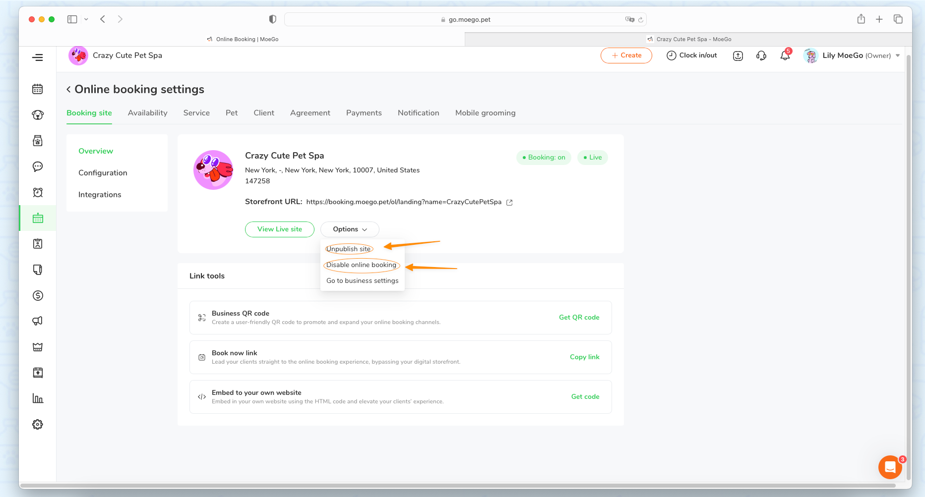 If you are having second thoughts about your online booking page, you can go to Online Bookings > Settings > Booking site > Overview > Options to unpublish the site or disable online booking.
