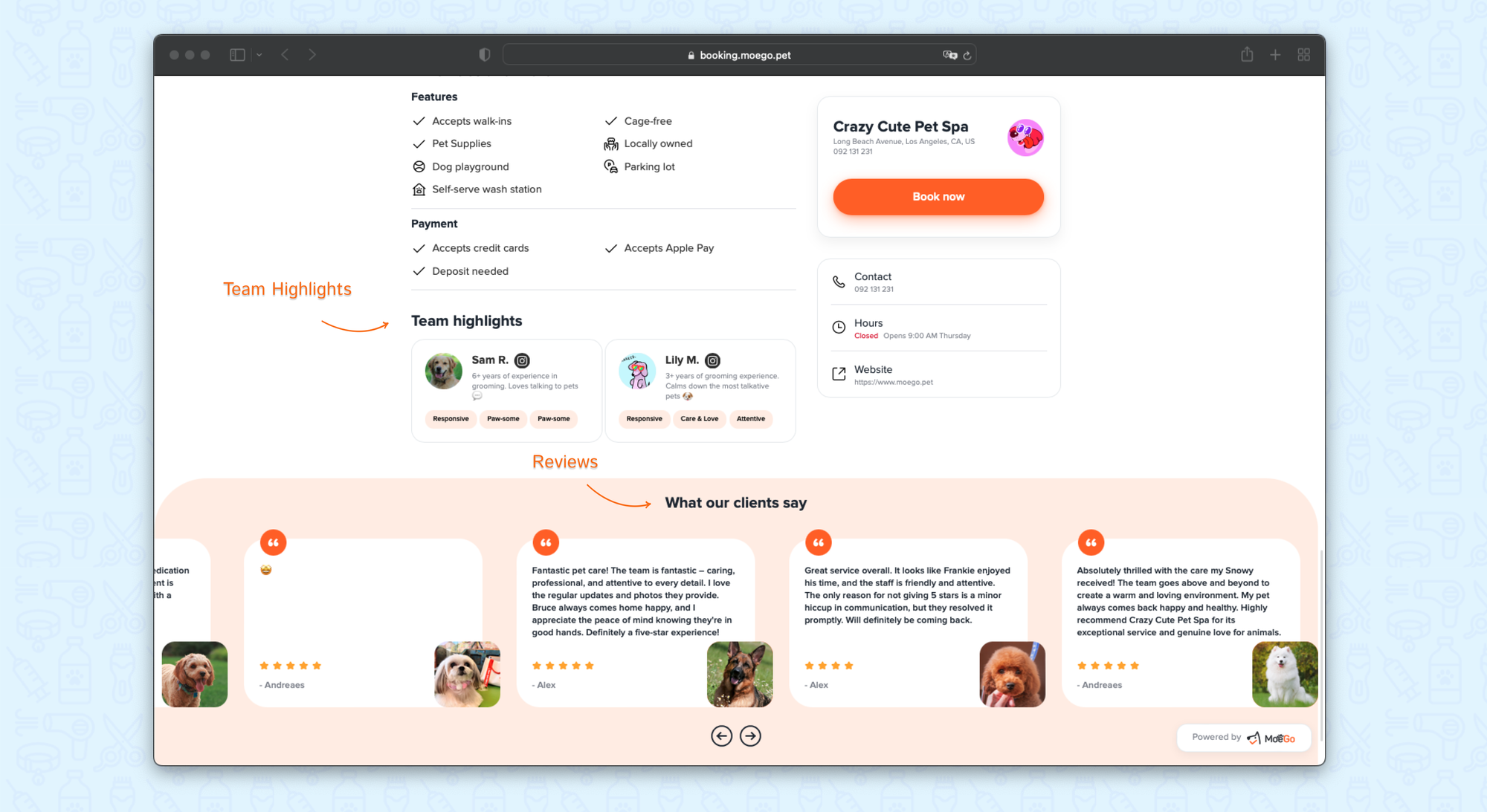 Team Highlights: Allow you to showcase your talented groomers. You can choose which team member(s) to display on the landing page. For each staff you highlight, provide a brief introduction, customized tags to show their personality and skills, and optionally, their Instagram link.