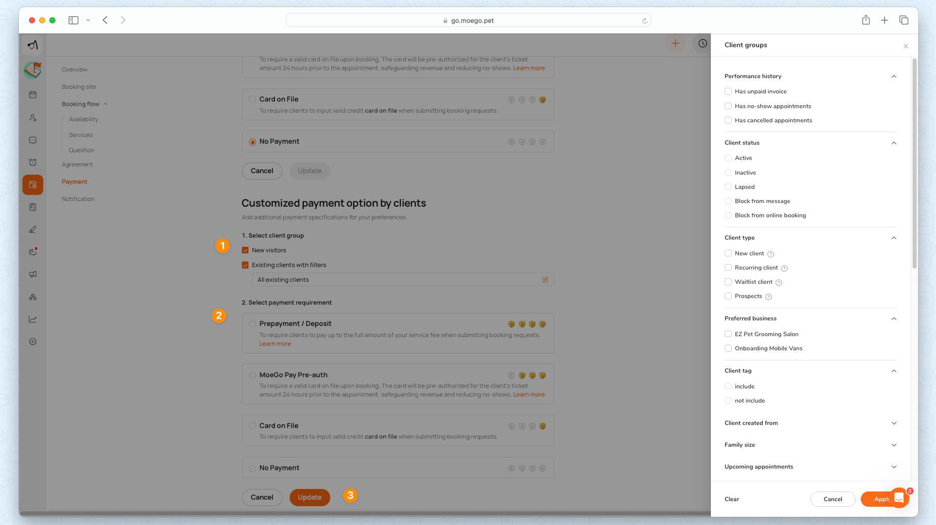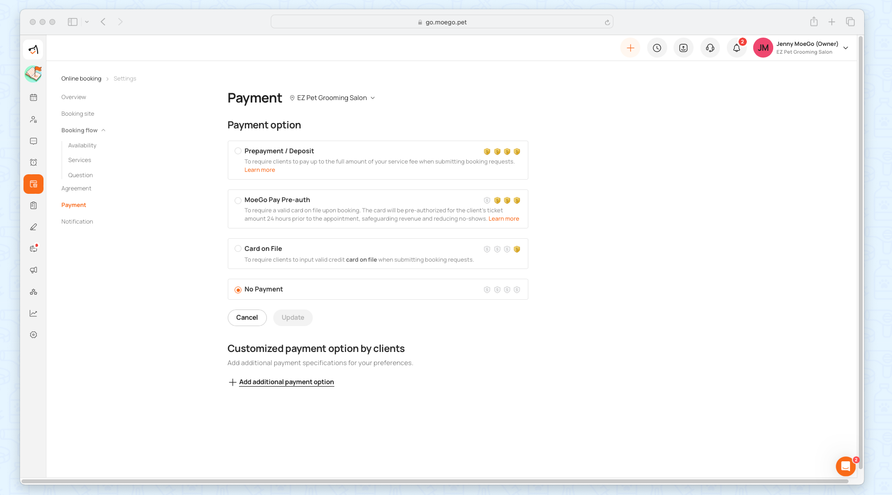 MoeGo's Online Booking system is where simplicity meets flexibility in managing client payments. With Payment Requirements and Customized Payment Options by Clients, our payment system is designed to cater to the diverse needs of your business.