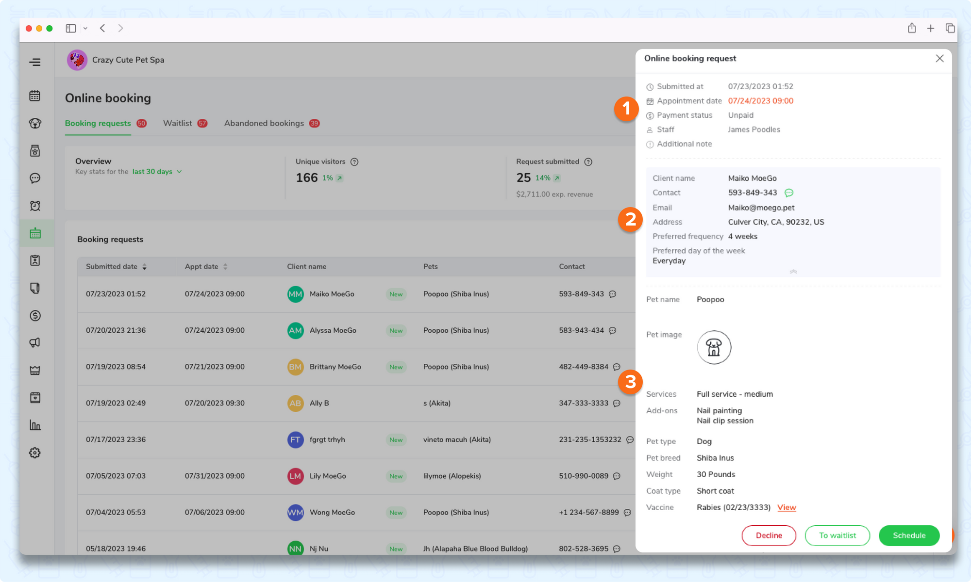 Click on the request to view the request detail. It will pop up from the right of the screen, where you can check the request details, client info, and pet info.