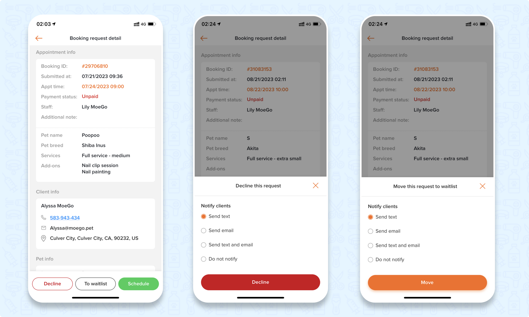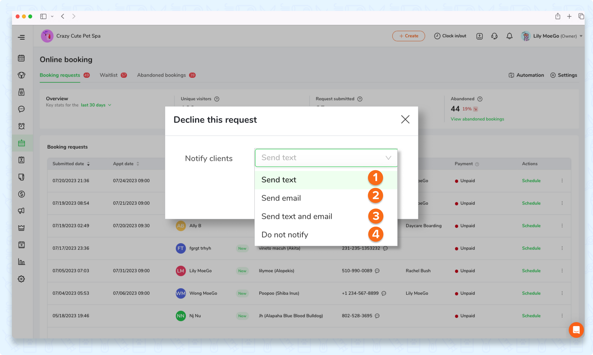 Click on < Decline> or < Move to waitlist > and decide whether or not to notify the clients, also notify in which way.