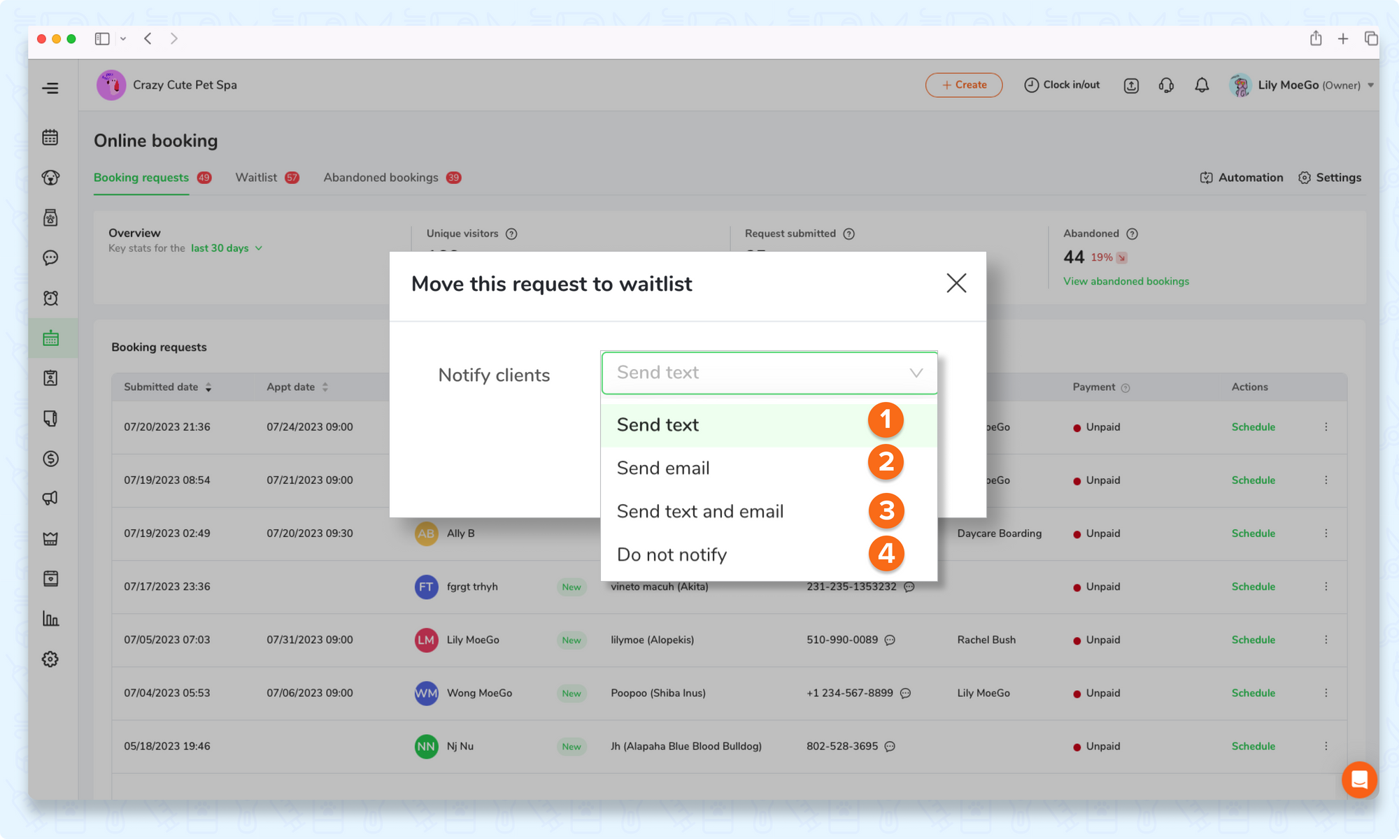 Click on < Move to waitlist > and decide whether or not to notify the clients, also notify in which way.