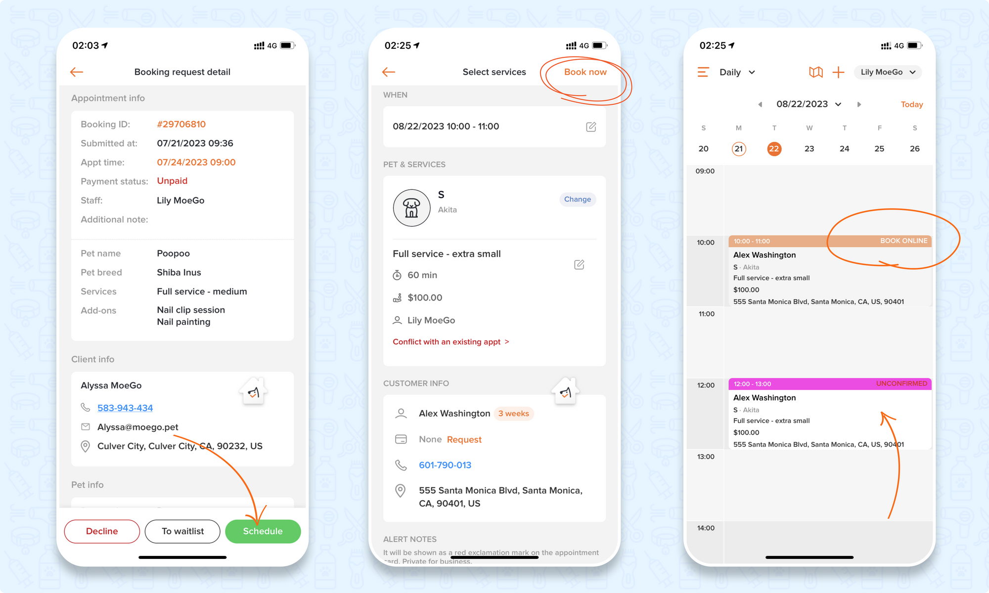 Click on < Schedule > will lead you to the edit booking page and then you can edit and book this appointment here.
