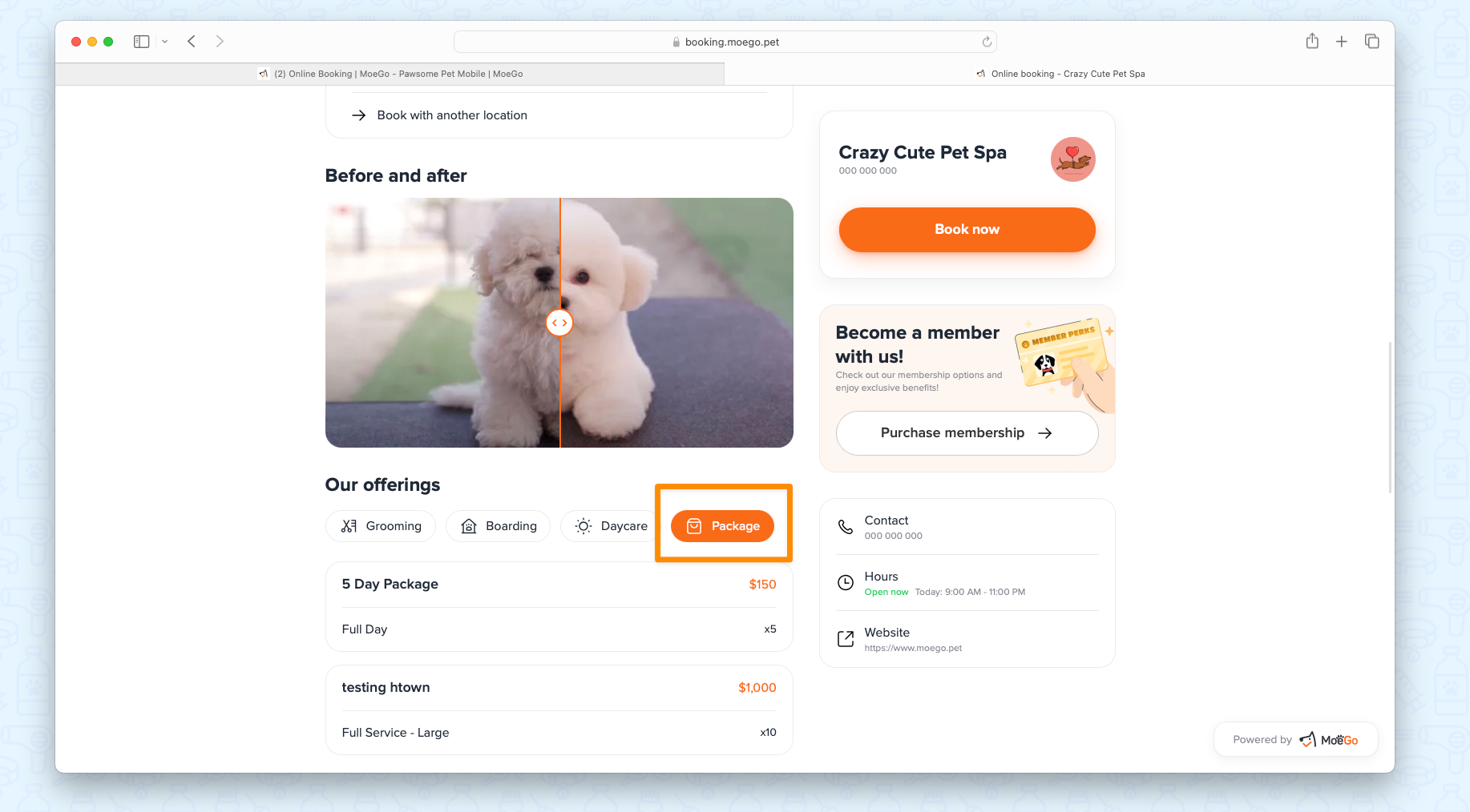 Once activated, clients will be able to view and purchase your packages from their end via different methods.