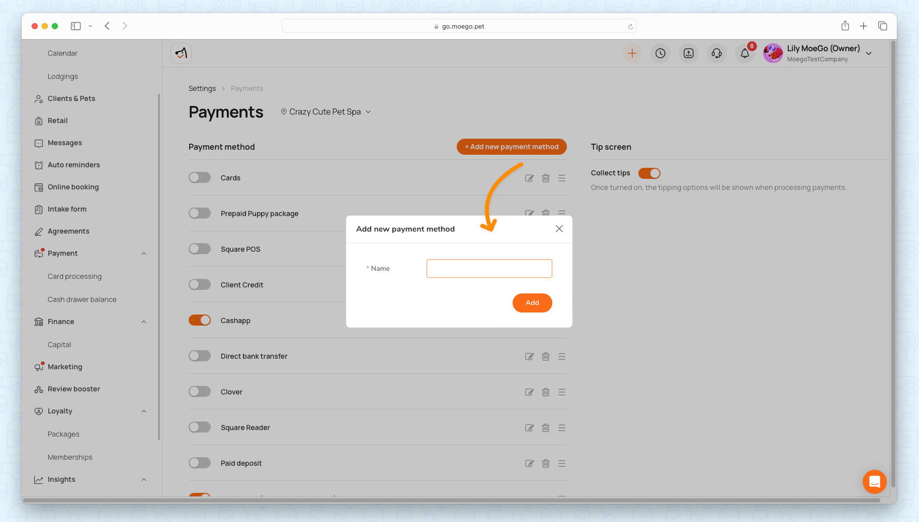 Click < Add new payment method > to name the new payment method.