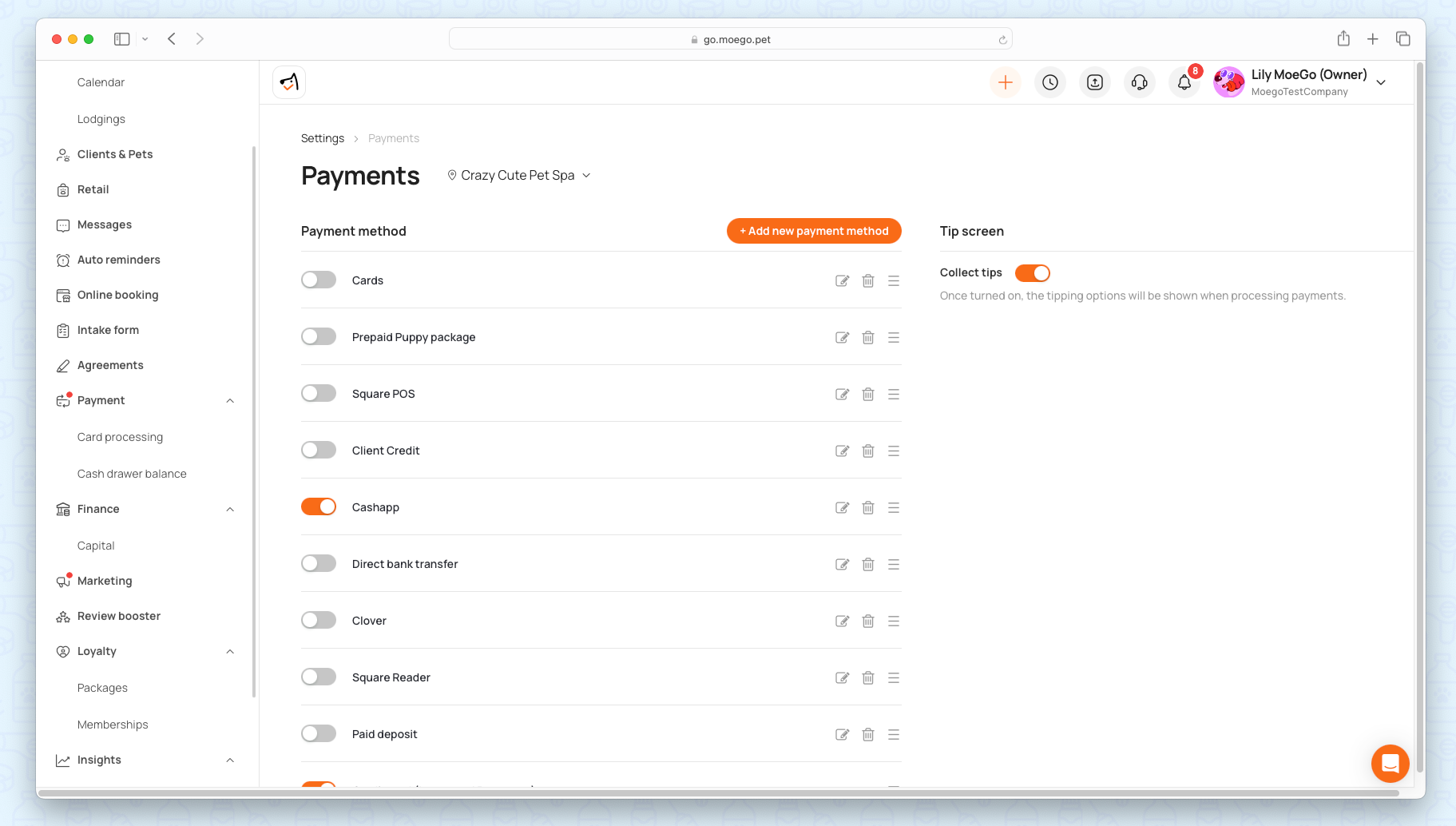 - Click <toggle> to turn on a payment method. Only turned-on methods will show up when taking payments.