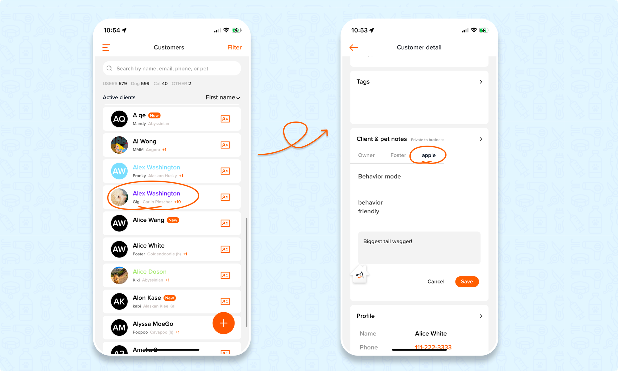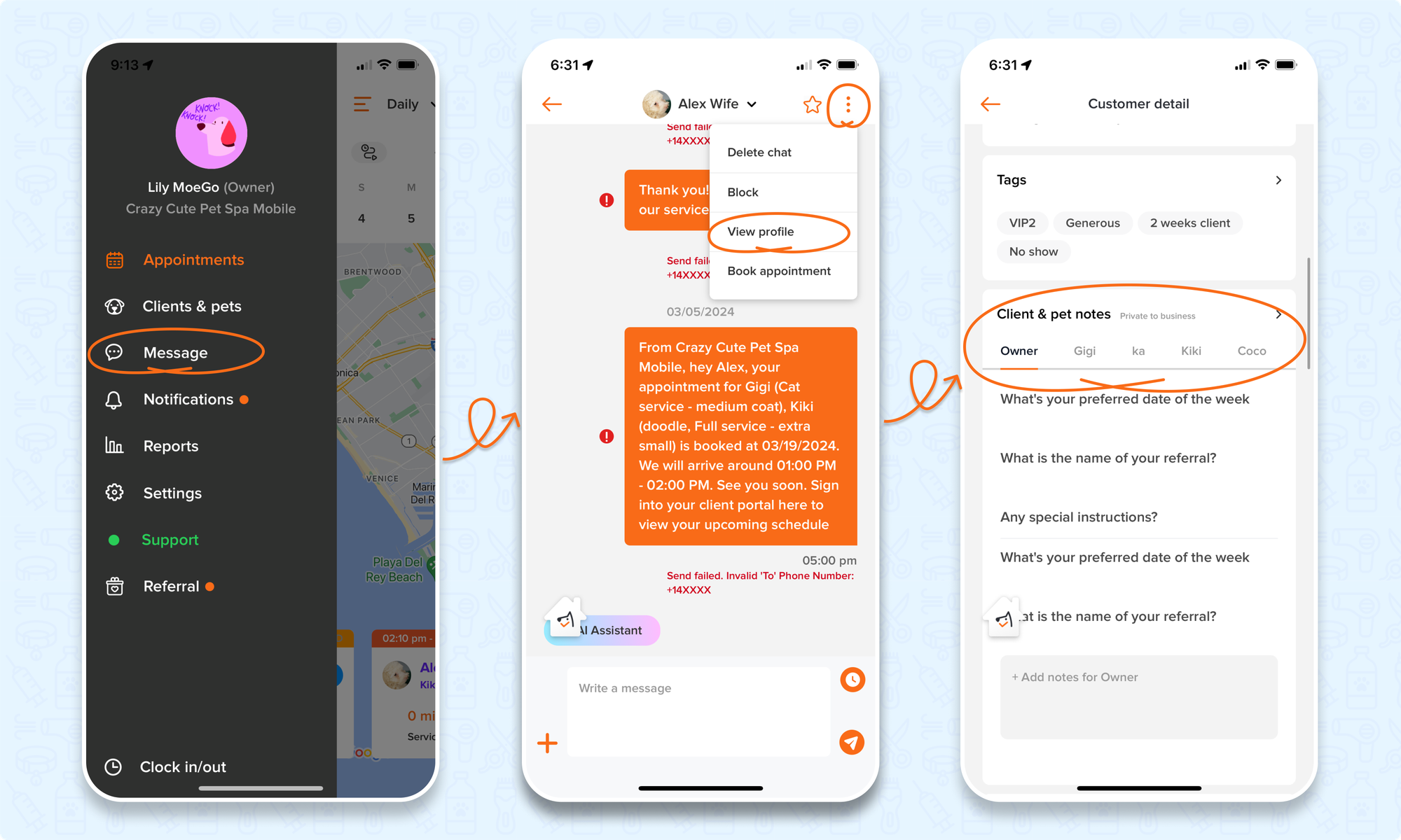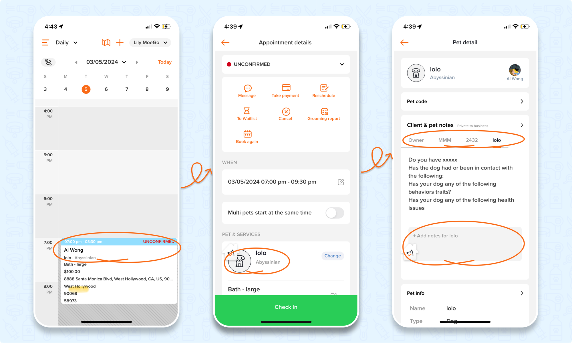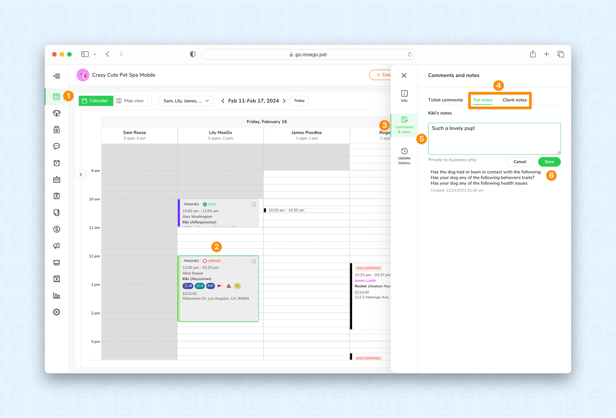 - Convenient Access: Easily access client and pet notes from the calendar view, client and pet profiles, and message center, making it effortless to stay organized and informed.