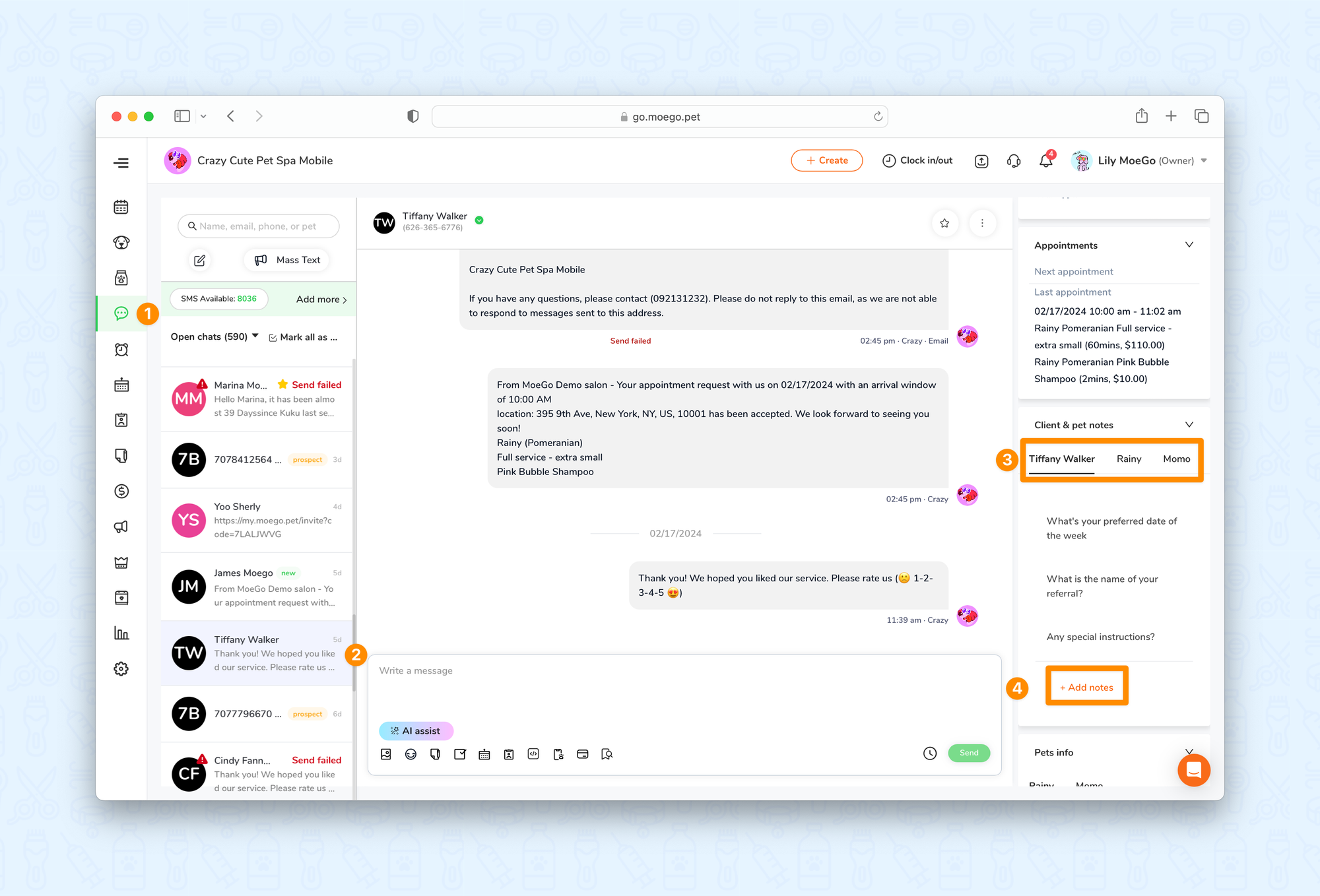 Easily view client and pet notes in the message center to stay informed and prepare before sending messages.