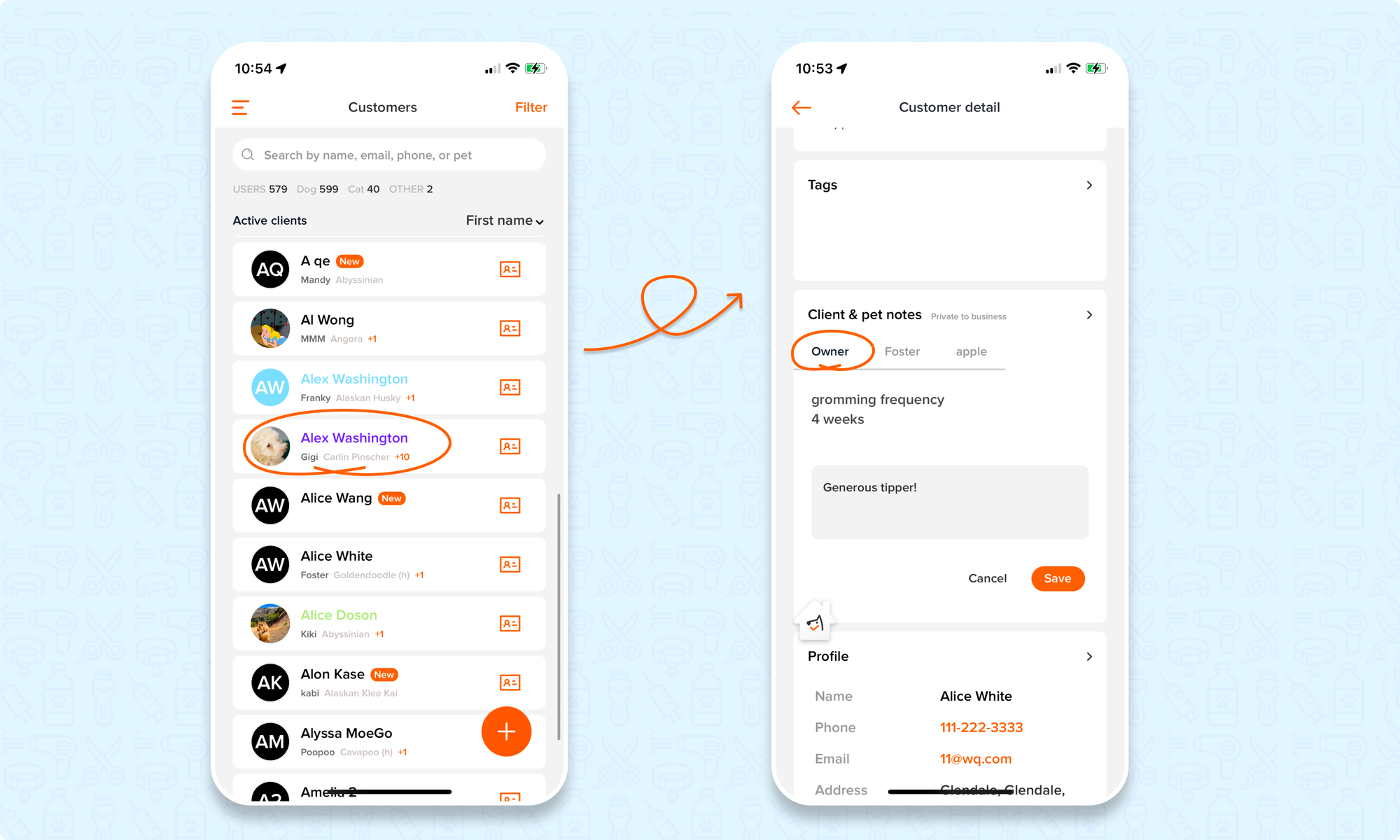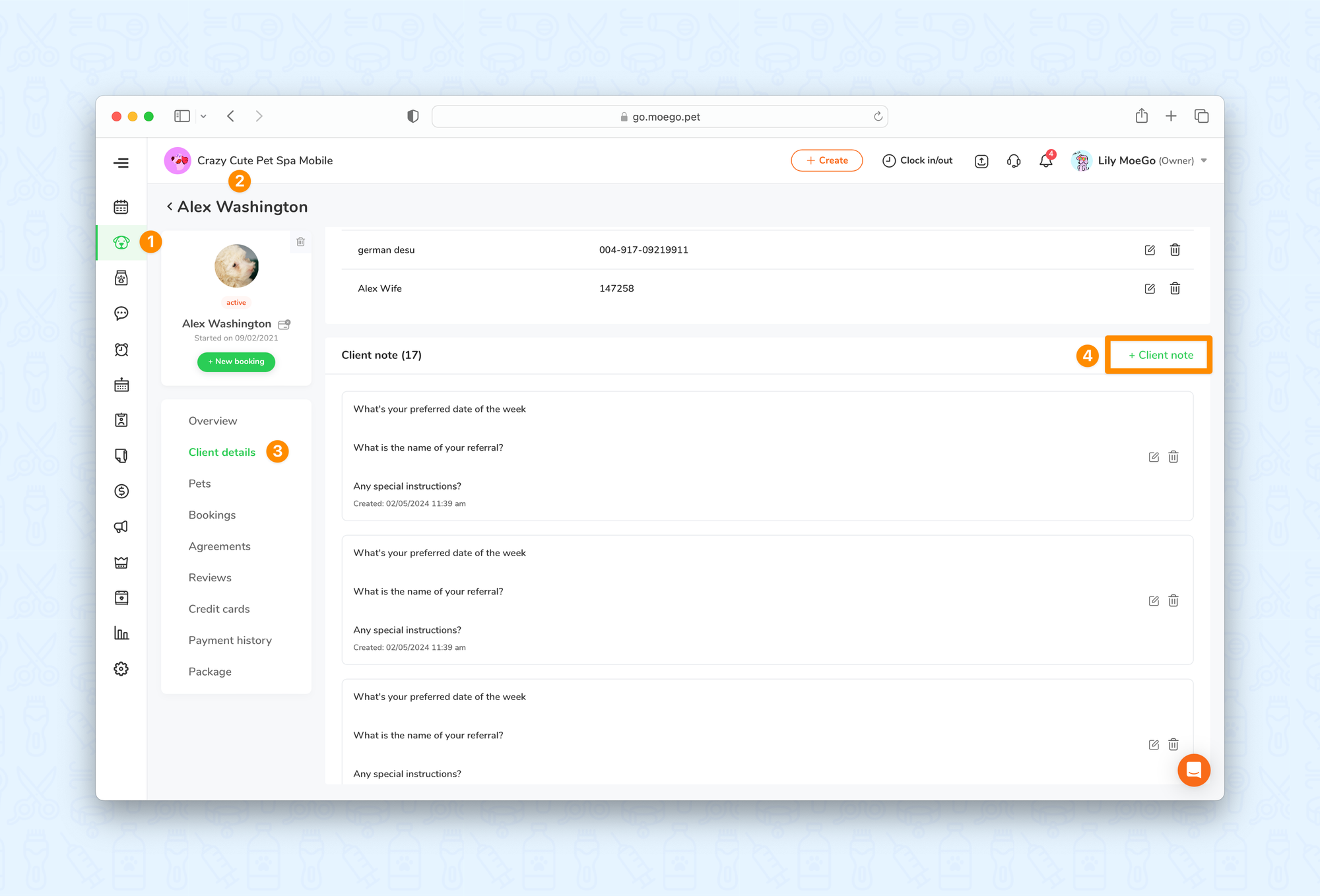 - Scroll down to Client & pet notes section and select the < owner > or < pet name >