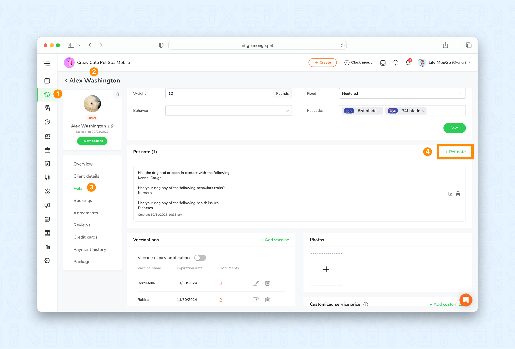 In the hustle and bustle of your daily tasks, jotting down notes becomes essential. With the client and pet notes feature, you and your staff can seamlessly add and edit notes for clients and pets at any time, ensuring smooth communication and record-keeping.