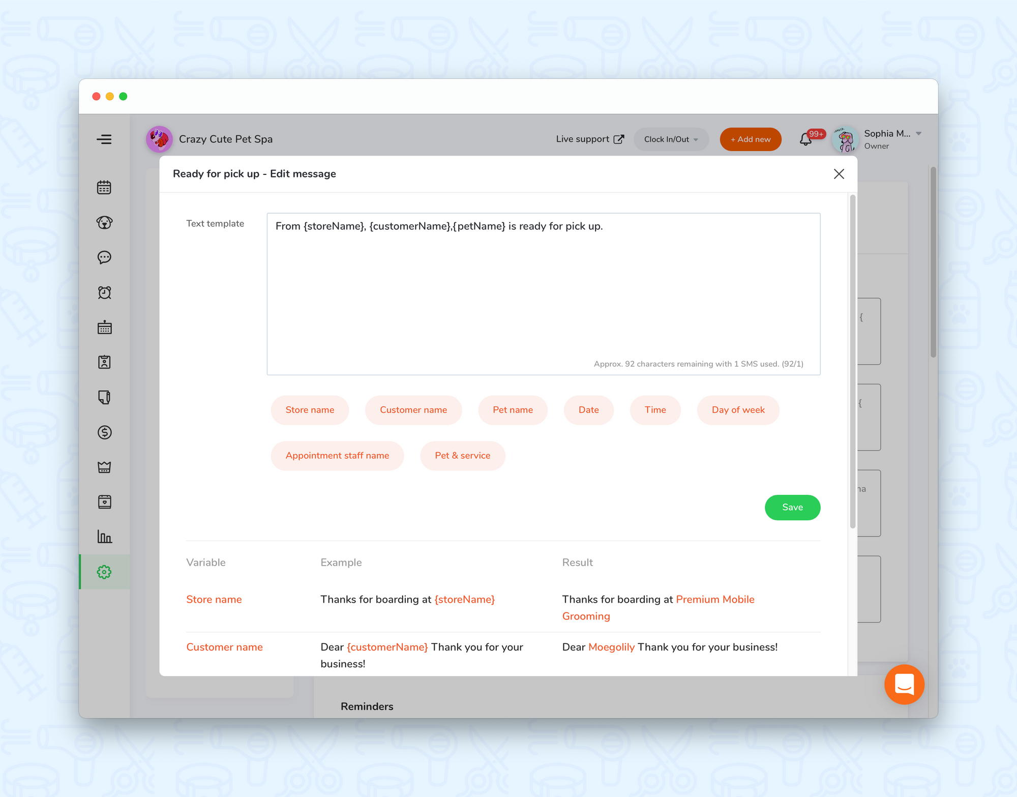 - Click on the text box on the right, the <Ready for pick up - Edit message> popup will appear