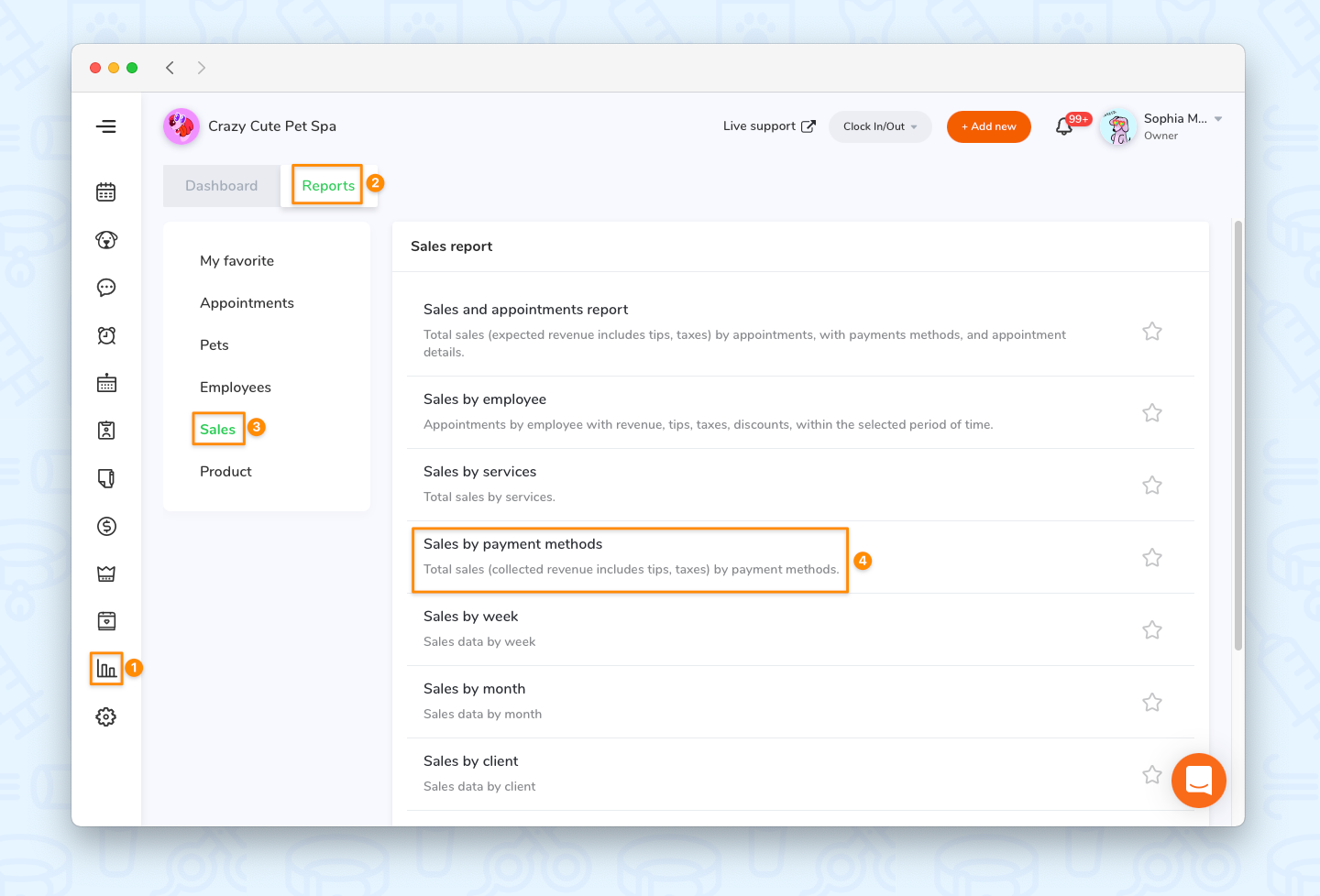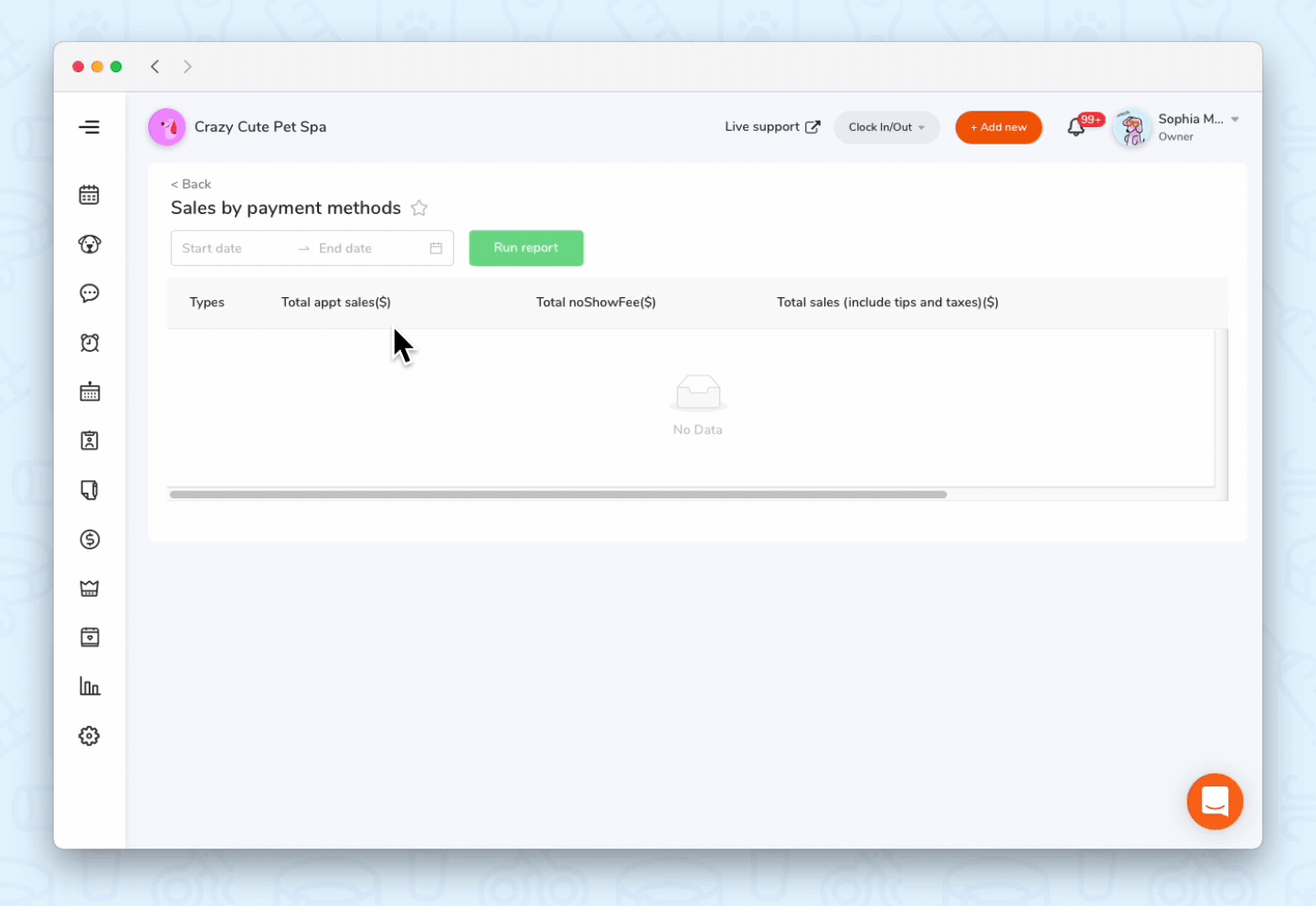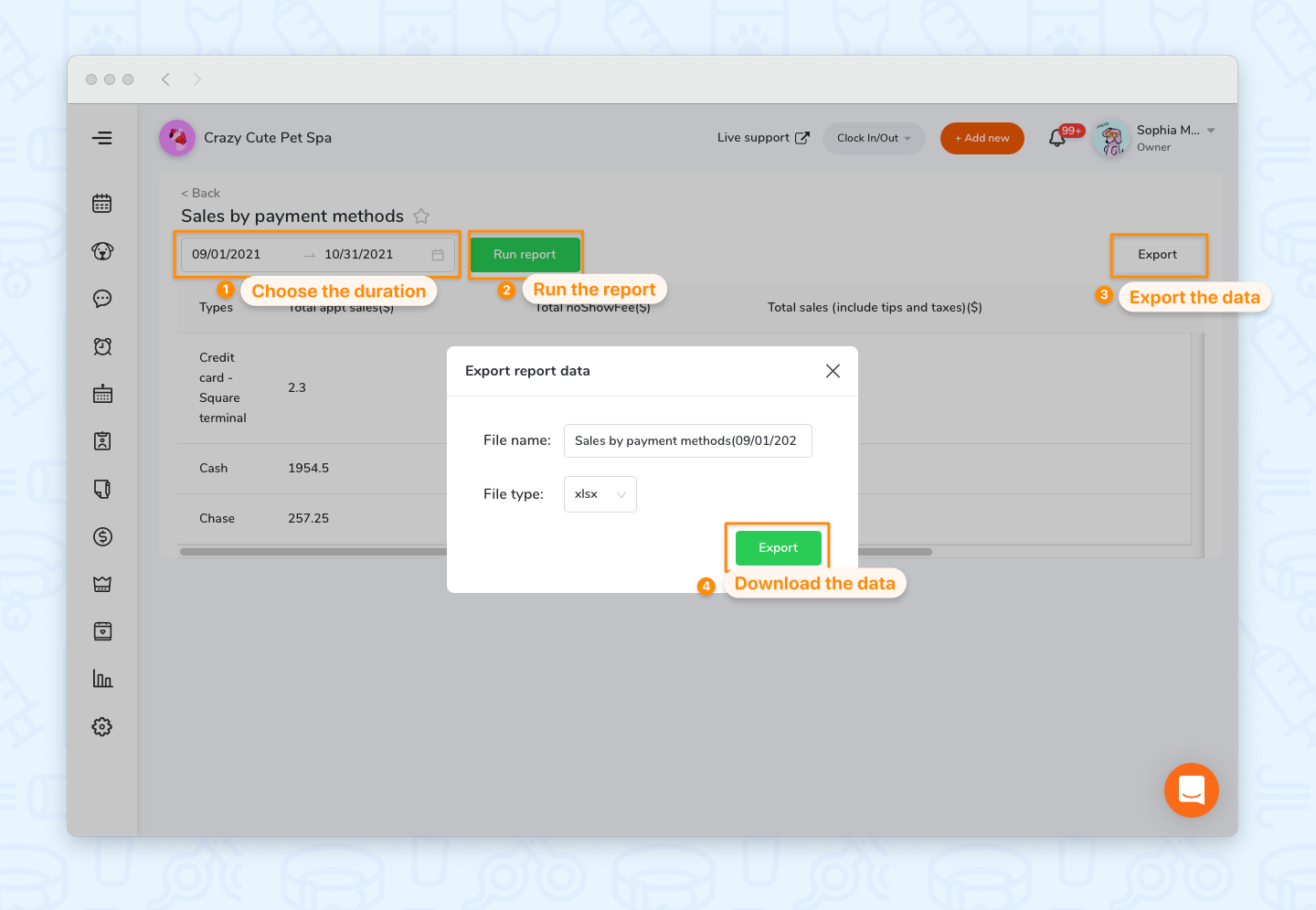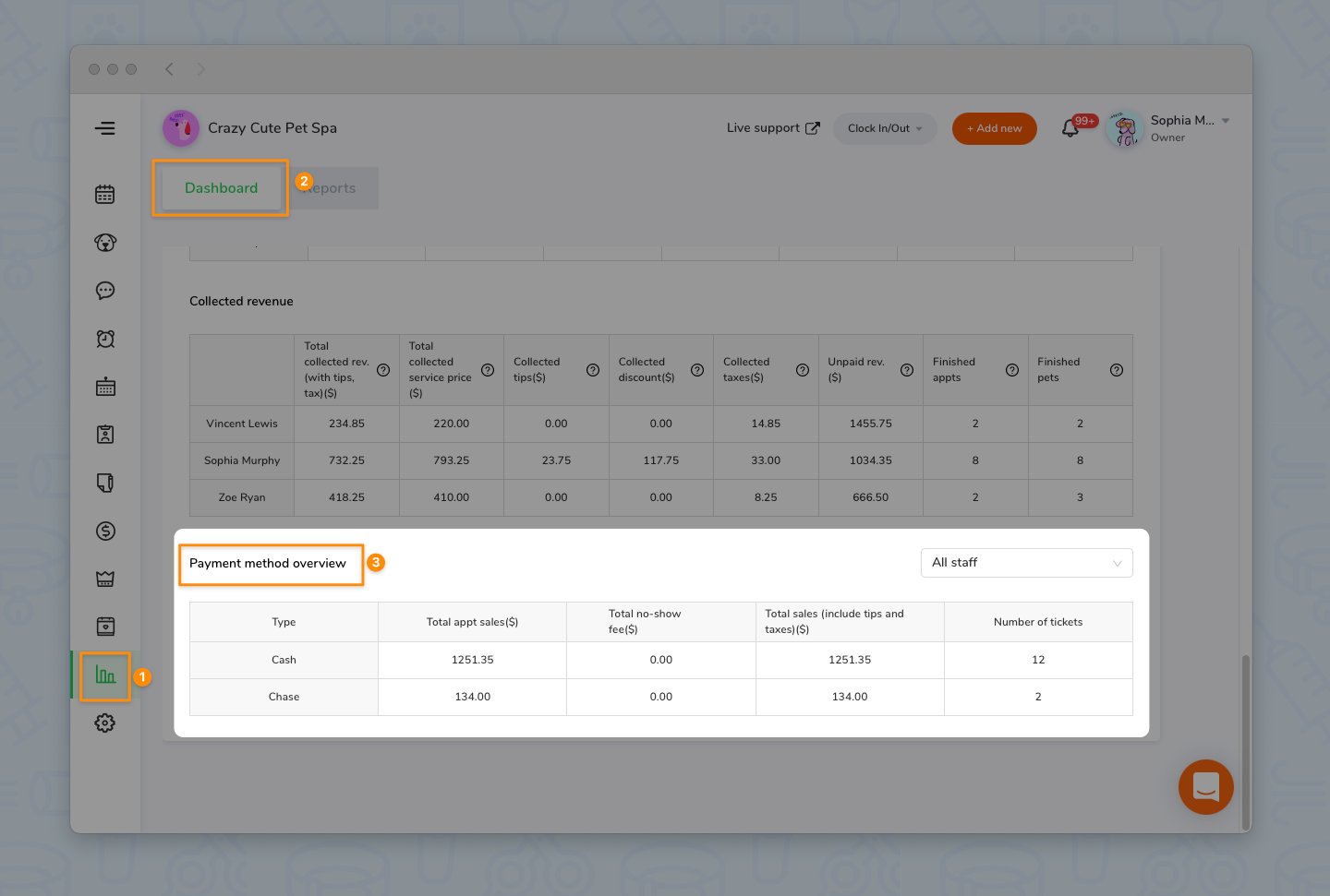 Total sales (collected revenue includes tips, taxes) by payment methods.