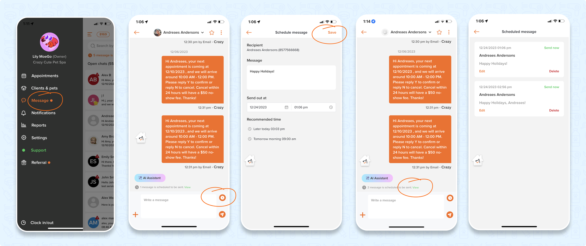 Go to Messages > Select a client > Click the clock icon next to the send icon. You can then enter the < Schedule message > page to edit your content and send time.