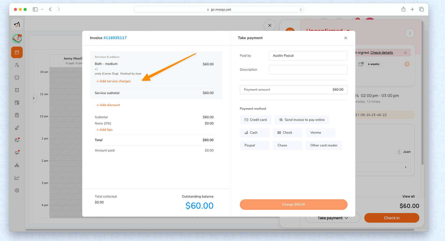 If you turn on <Automatically apply during checkout> when configuring your service charges, they will be added to the appointment upon checkout.