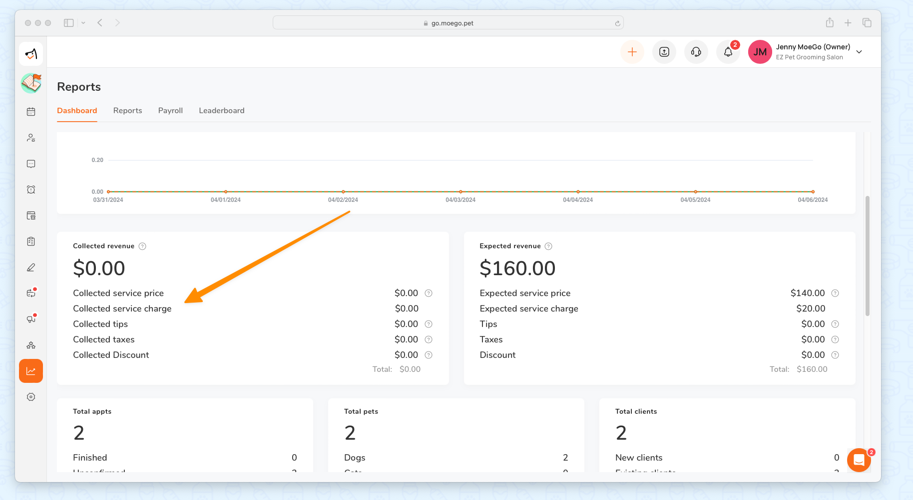 Overall service charges expected/collected for a given time range will be included in the revenue breakdown view in Reports > Dashboard.