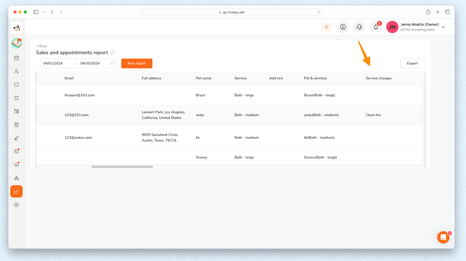 Service charges expected and collected for specific appointments can be found in Reports > Reports > Sales> Sales and Appointments report.