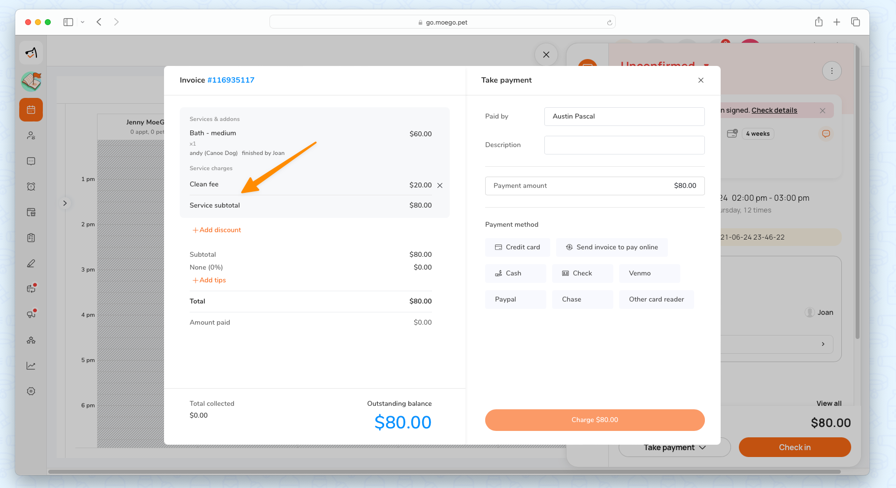MoeGo now offers a Service Charge setting for each appointment! You can manually or automatically add a service charge such as a travel fee or cleaning fee to every appointment besides the basic service price.