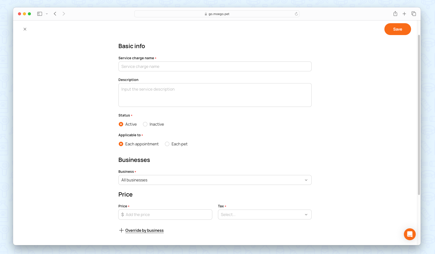 - Set up the price and tax for the service charge. * Additionally, if you run multiple businesses, you can "add override by business".