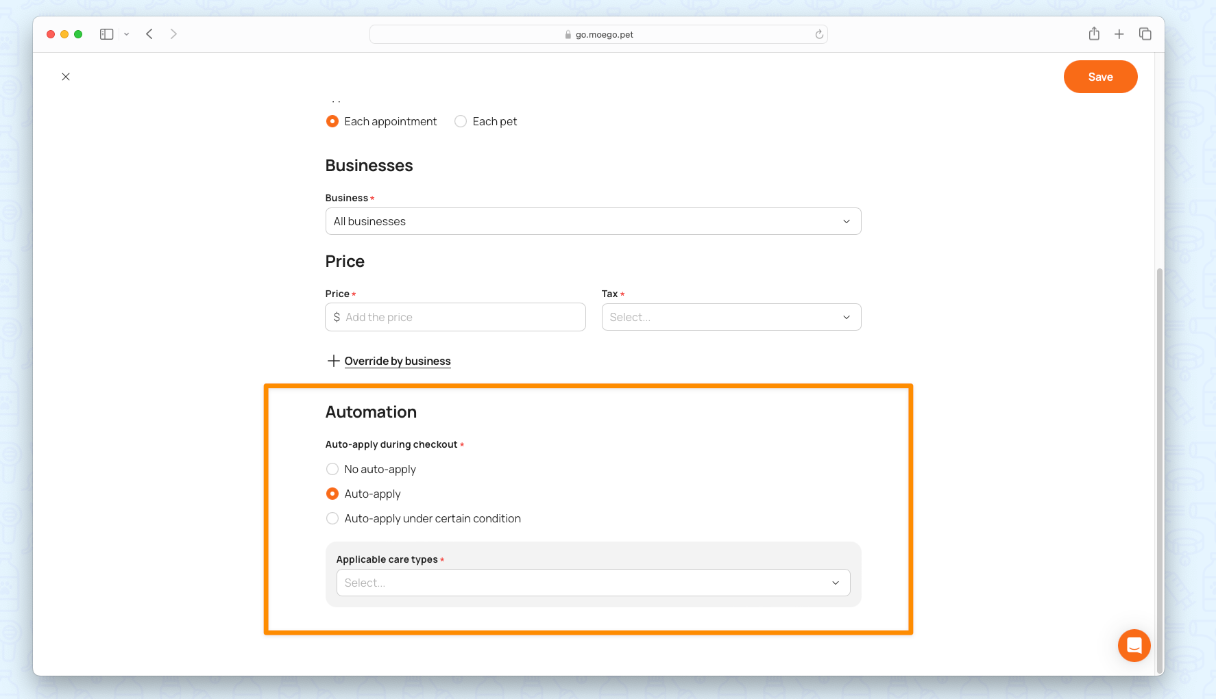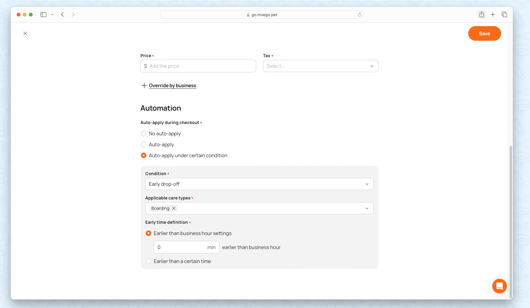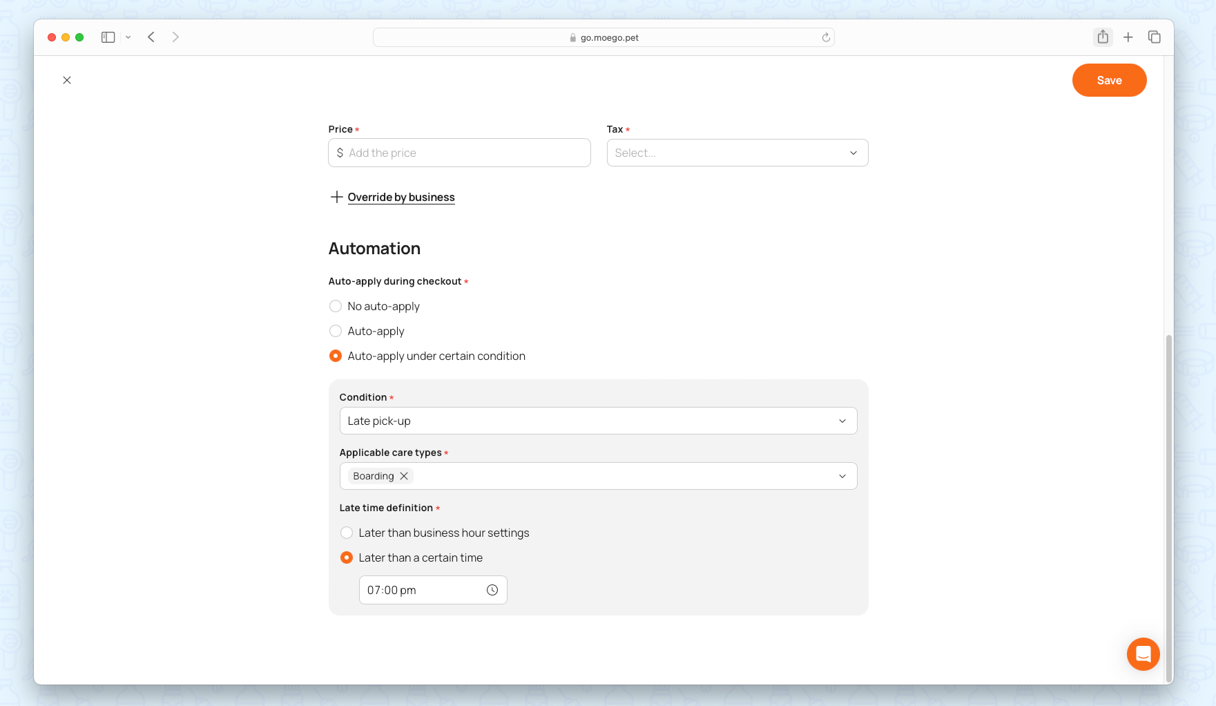 - Auto-apply based on service type: You can configure service charges to auto-apply to specific service types, including Boarding, Daycare, Grooming.