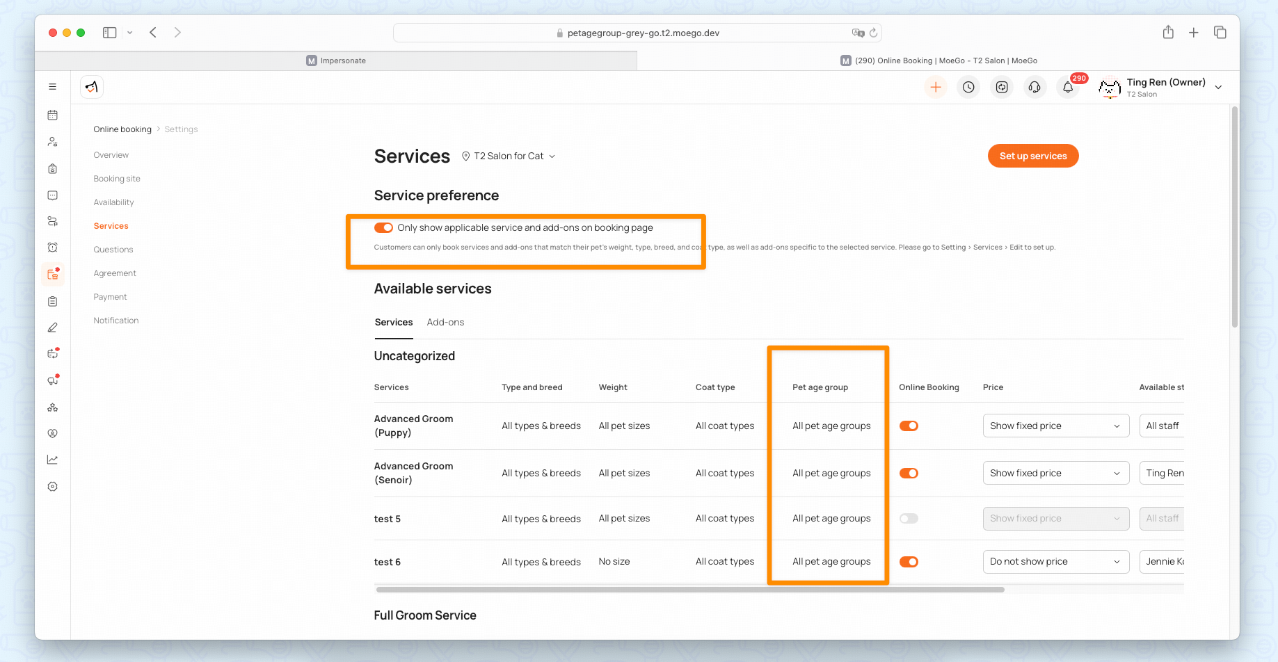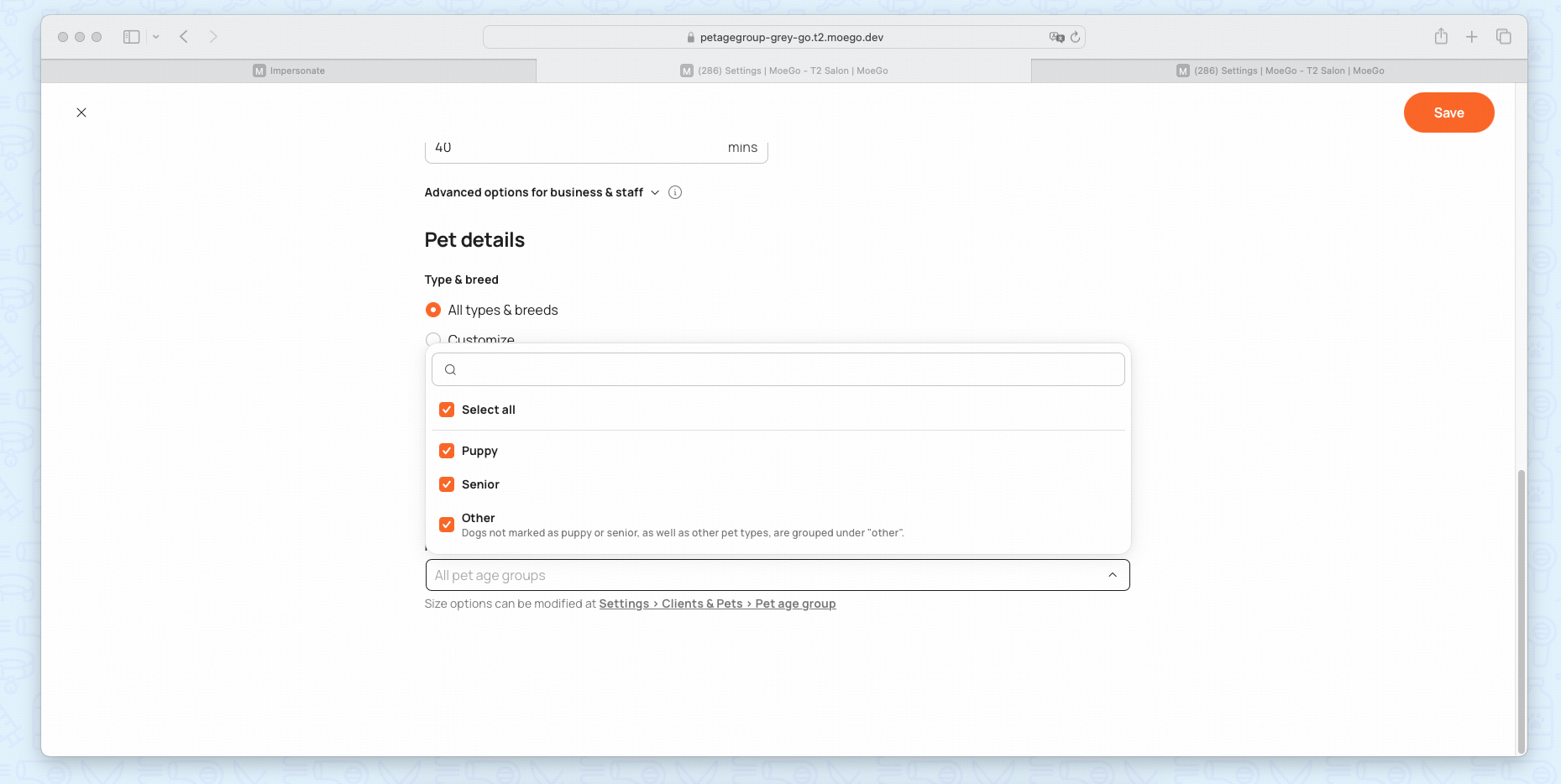 - Turn on Show only applicable services to ensure clients only see services that match their pet’s age group.