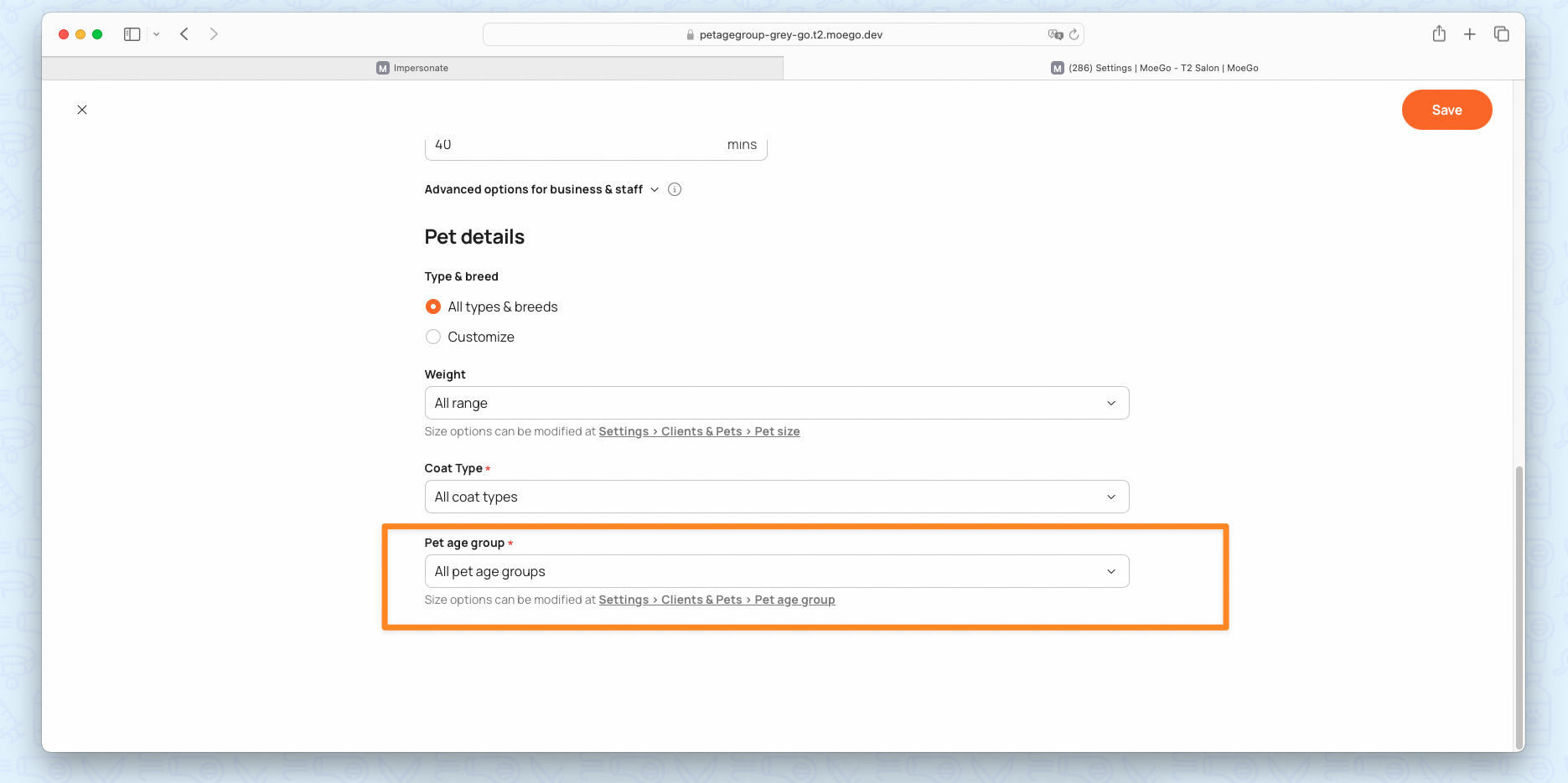 Navigation: Go to Settings > Clients & Pets > Pet age group