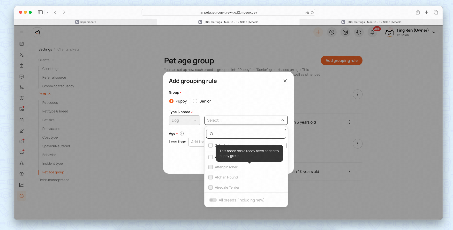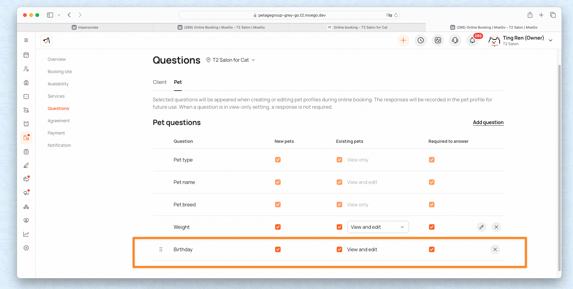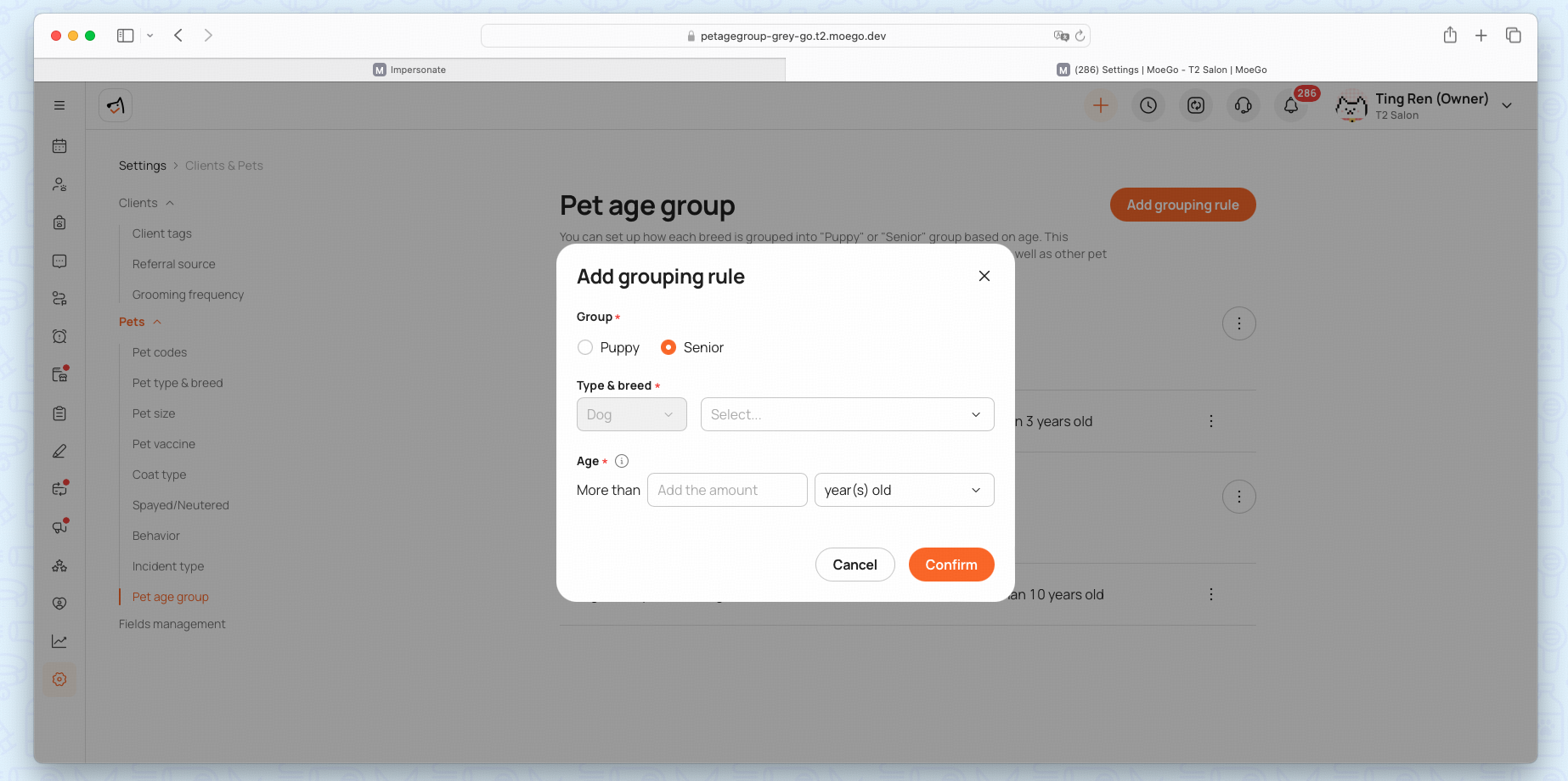 - Enable Require pet birth date so MoeGo can automatically determine the pet’s age group.