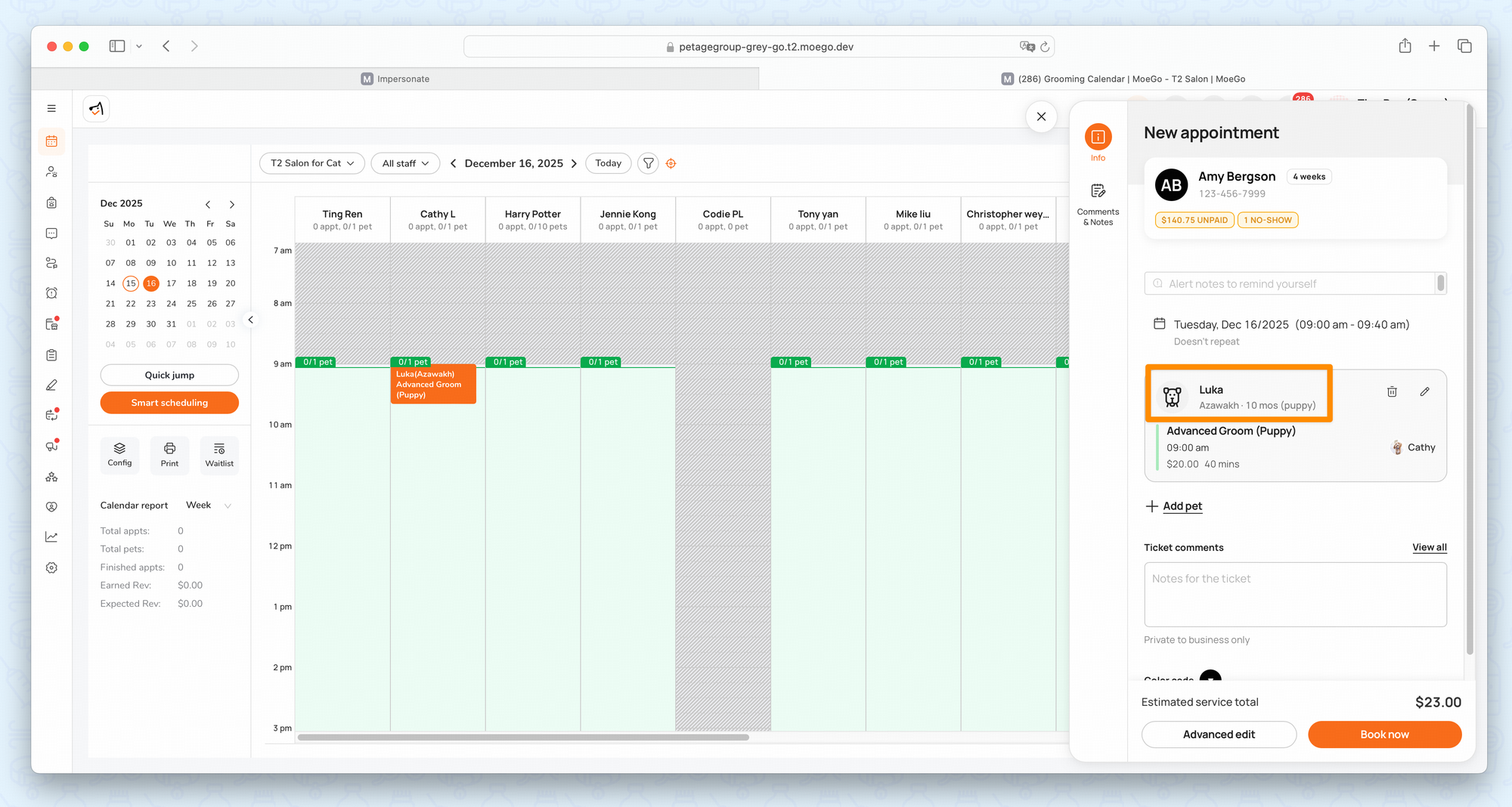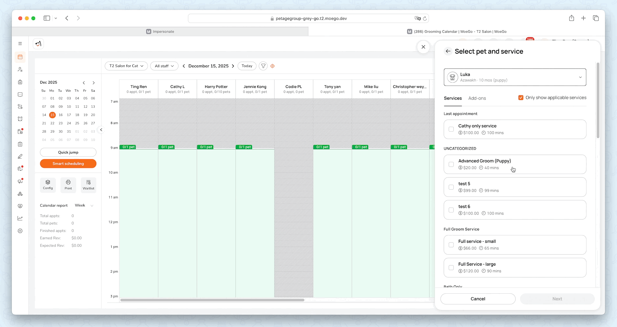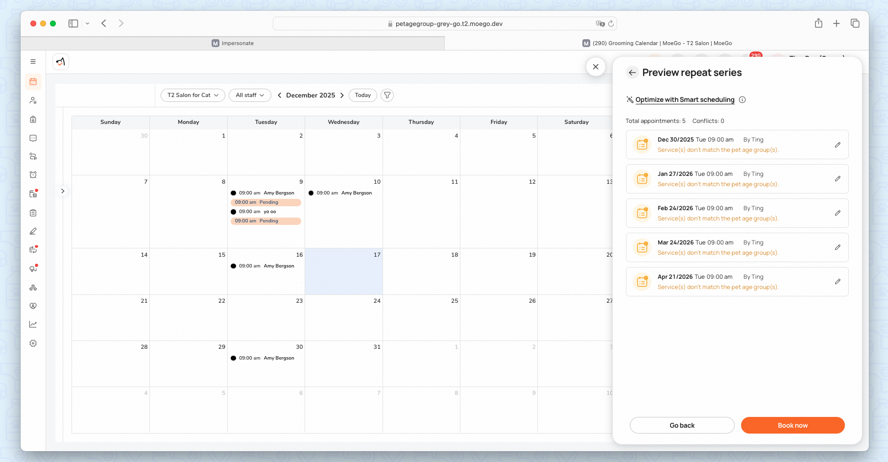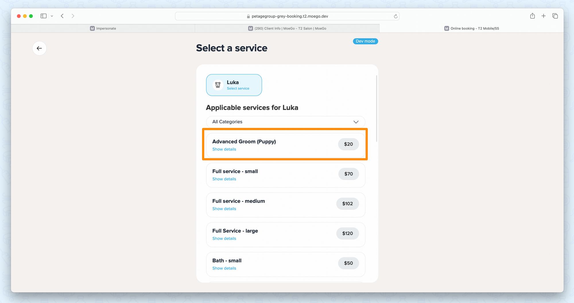 Once Service Price by Pet Age is set up, age-based service availability and pricing automatically apply when creating appointments from the business side.